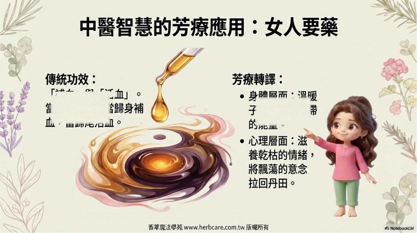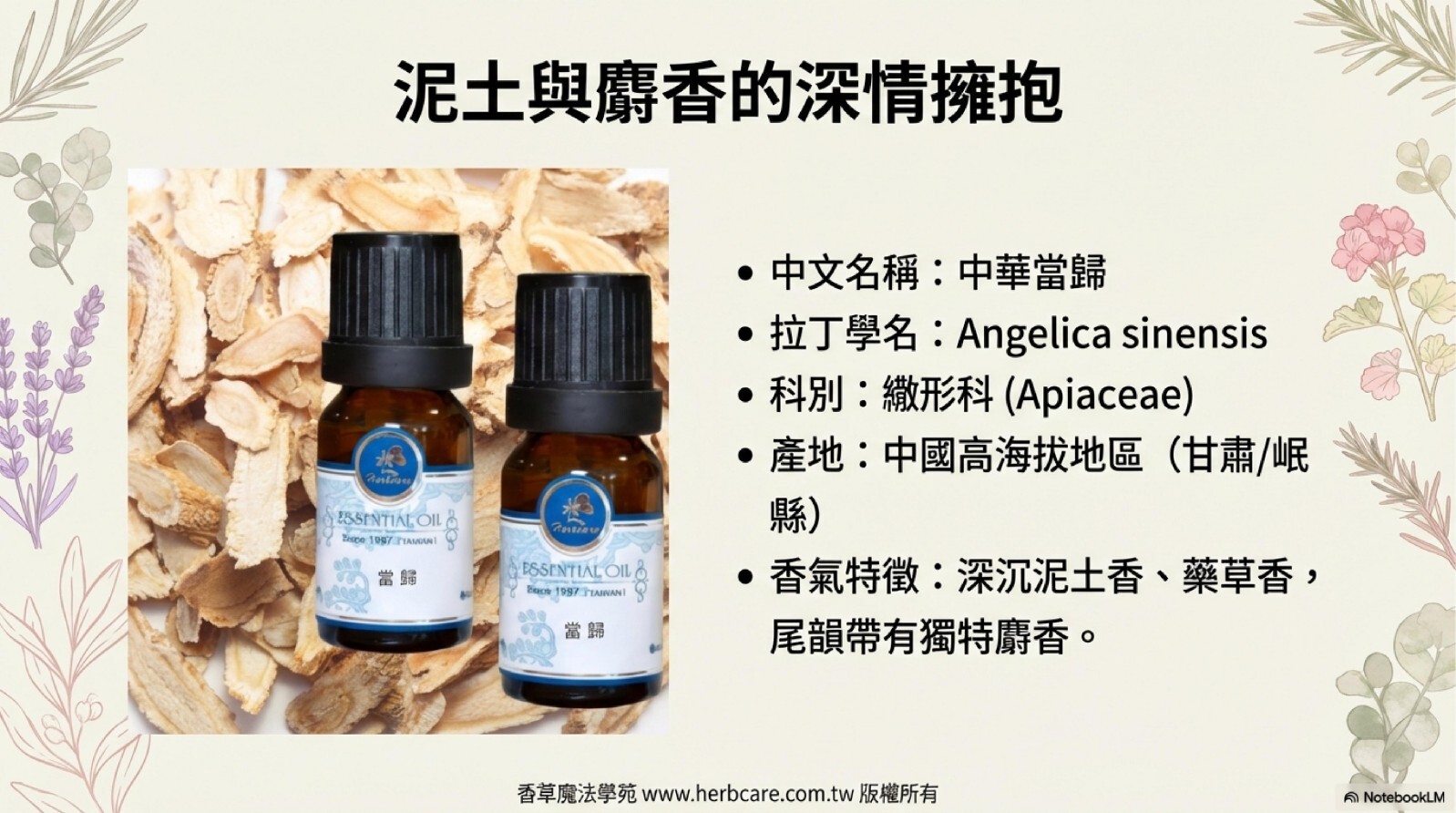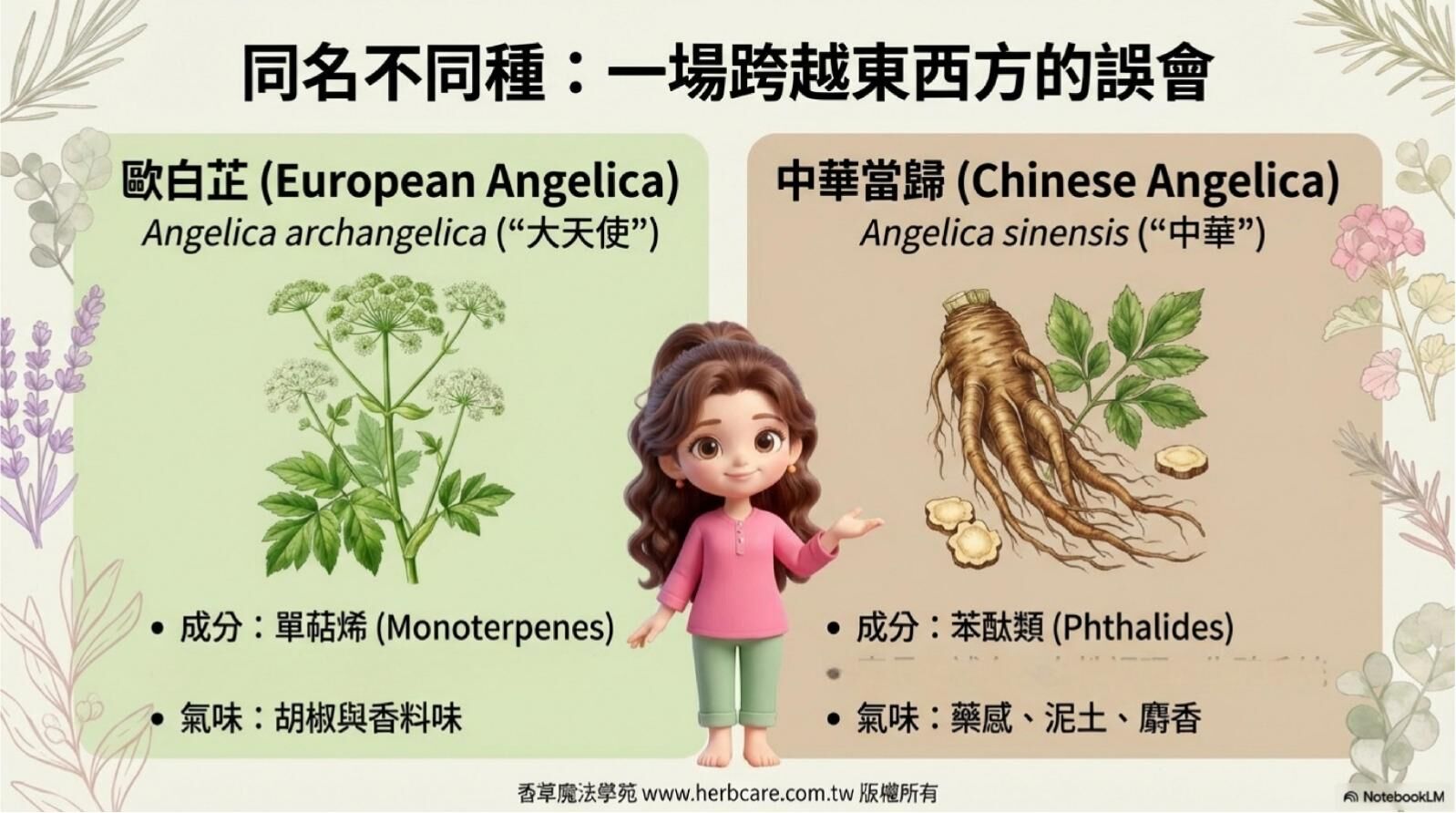 中華當歸主補血,氣味甜膩;歐白芷(西洋當歸)則長於「補氣」與「神經系統的修復」,氣味帶有珍貴的麝香調,是香水界極為昂貴的定香劑原料。