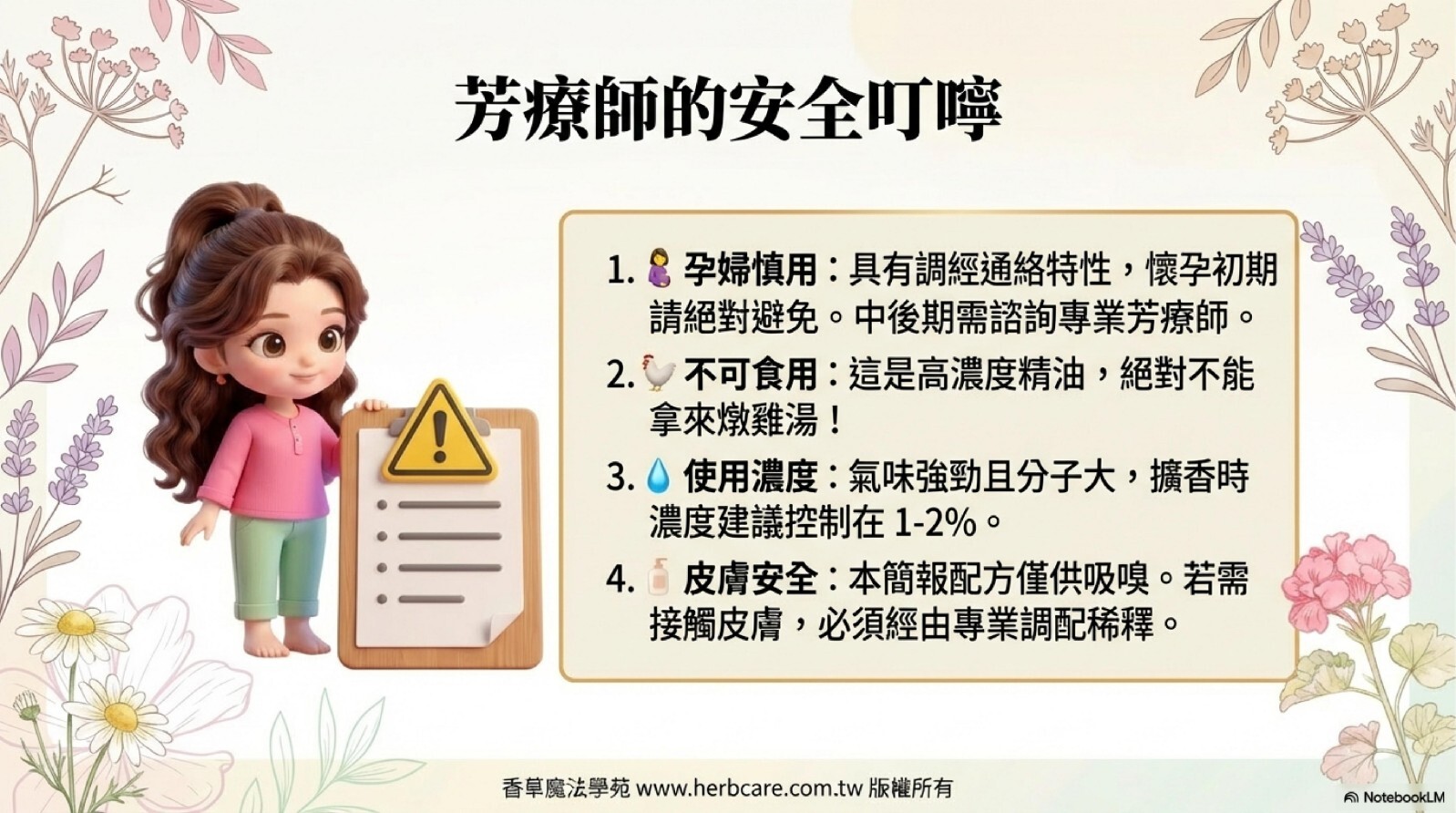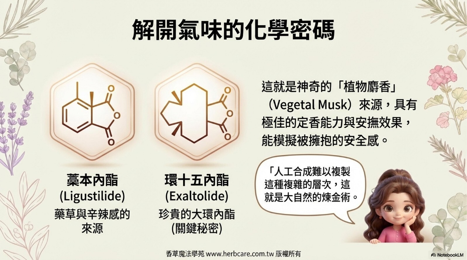| Exaltolide (環十五內酯) | 微量 | 關鍵成分! 賦予精油獨特的「麝香」後味,具有極佳的定香能力與安撫效果。 |
