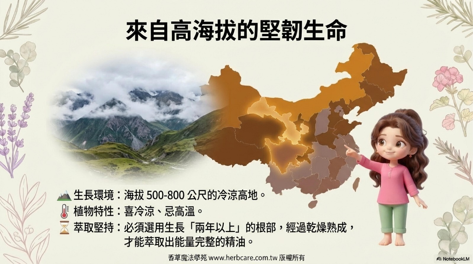 | 萃取部位 | 根部 (需生長兩年以上) | 萃取方式 | 蒸氣蒸餾法 |