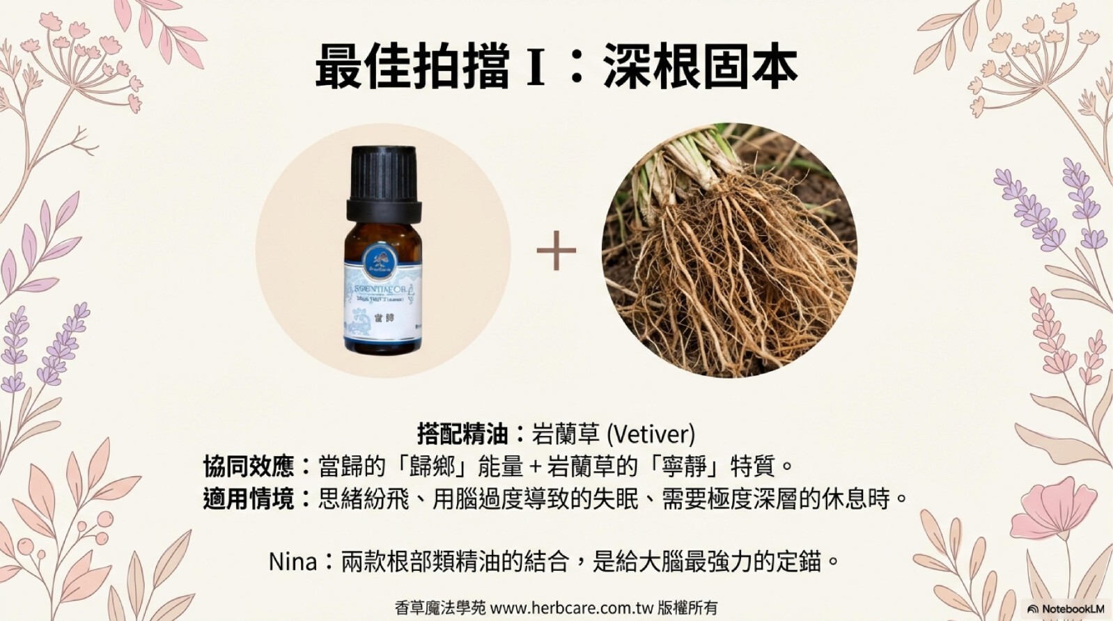 不同於花朵類精油的甜美,當歸精油散發著一股深沉的泥土香、藥草香與獨特的麝香調。它像是一位充滿智慧的長者,給你最厚實的擁抱。無論是大病初癒的虛弱,或是心靈上的驚恐不安,它都能幫助你「固本培元」,找回雙腳踩在地上的安全感。