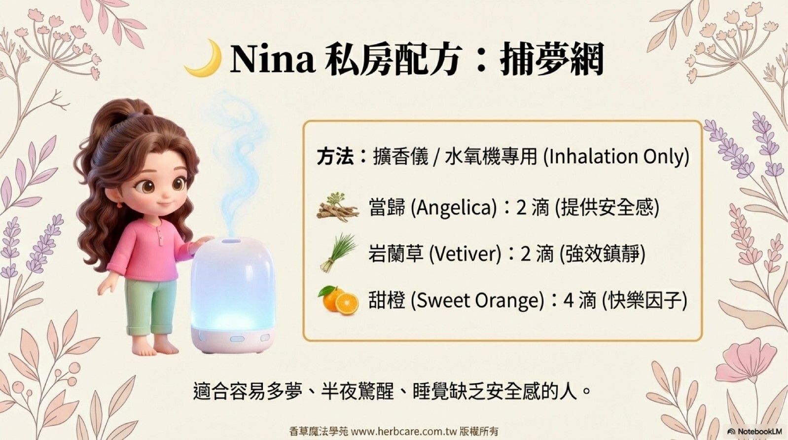 👉 用法: 滴入擴香儀。適合睡覺容易多夢、驚醒的人。