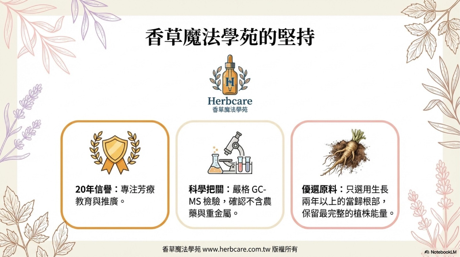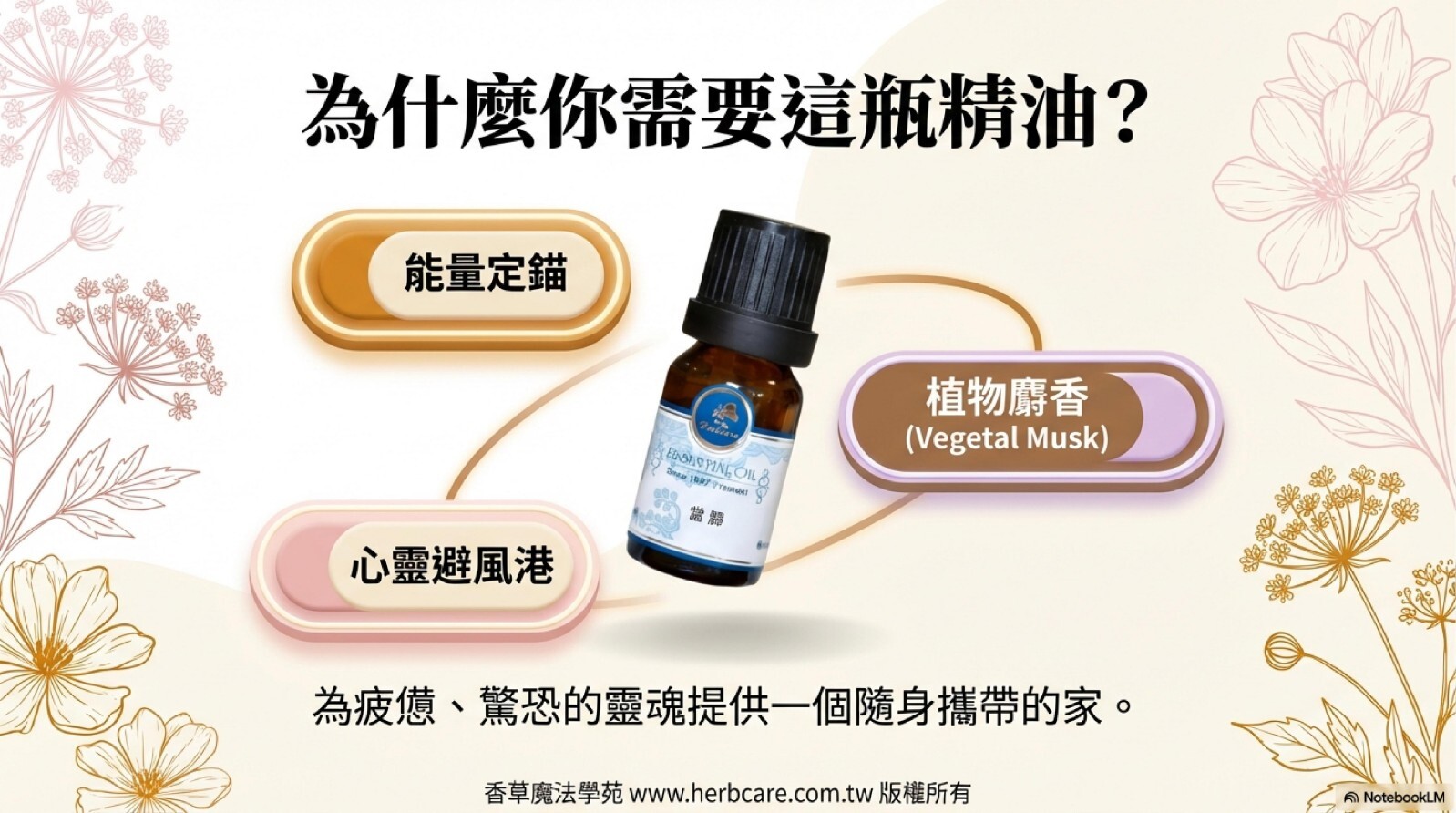 歐白芷根是芳療中珍貴的「定海神針」。 在香草魔法學苑,我們只選用生長超過兩年的根部萃取, 保留最完整的能量與香氣。我們不只賣精油,更希望成為你身心安頓的港灣。