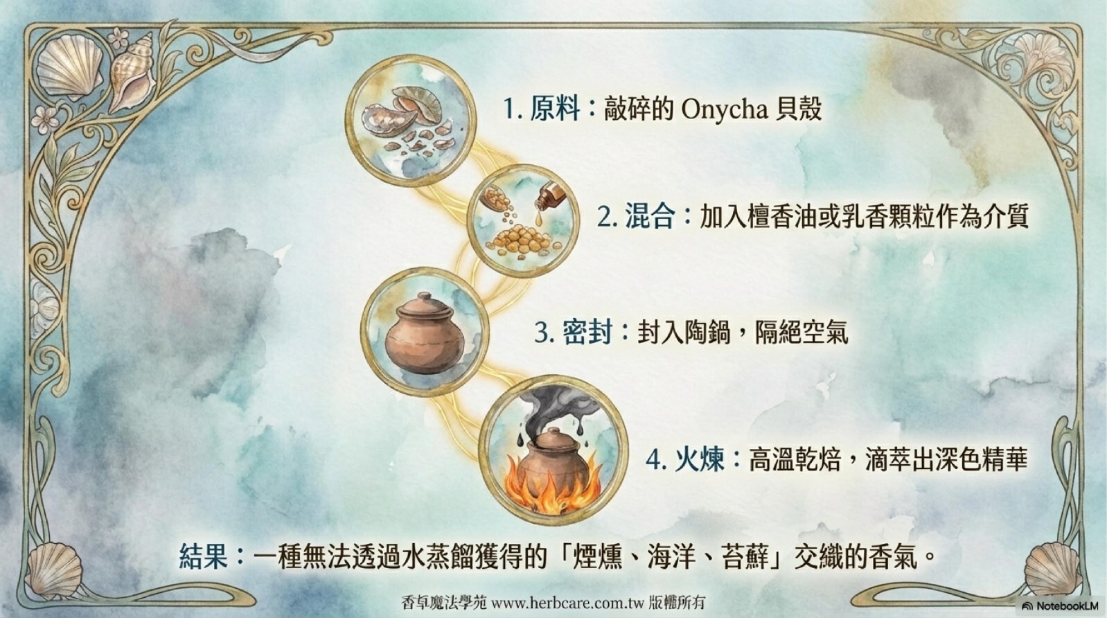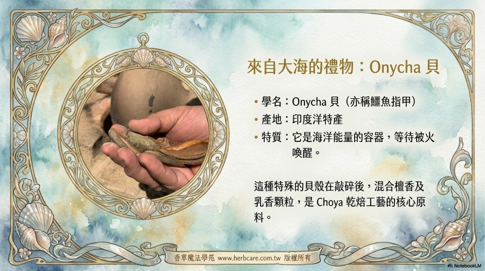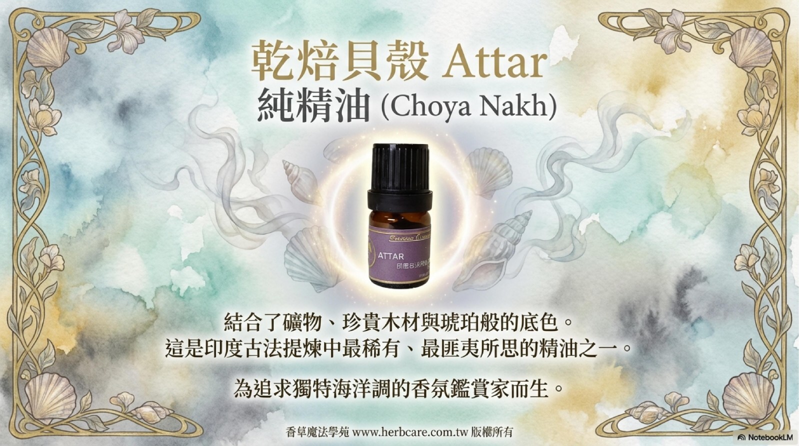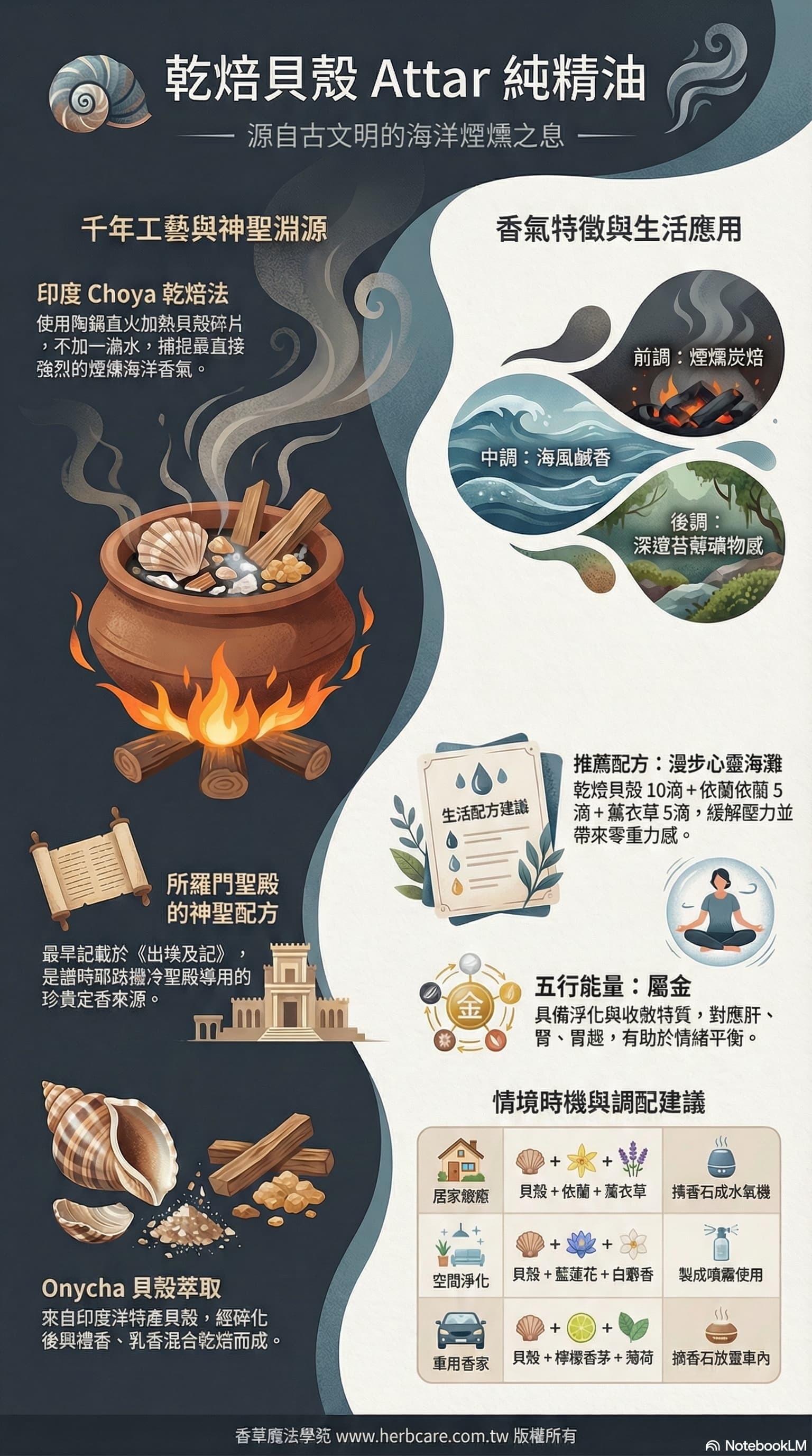 🐚乾焙貝殼精油|海洋煙燻的療癒之息遵循印度千年Choya乾焙工藝,精選印度洋特產Onycha貝殼,以陶鍋直火無水萃取凝香。「海洋三重奏」從煙燻炭焙漸變至海風鹹香,終曲沉澱為苔蘚礦物的深邃餘韻。特別推薦給追求獨特海洋調與心靈療癒的香氛鑑賞家。
