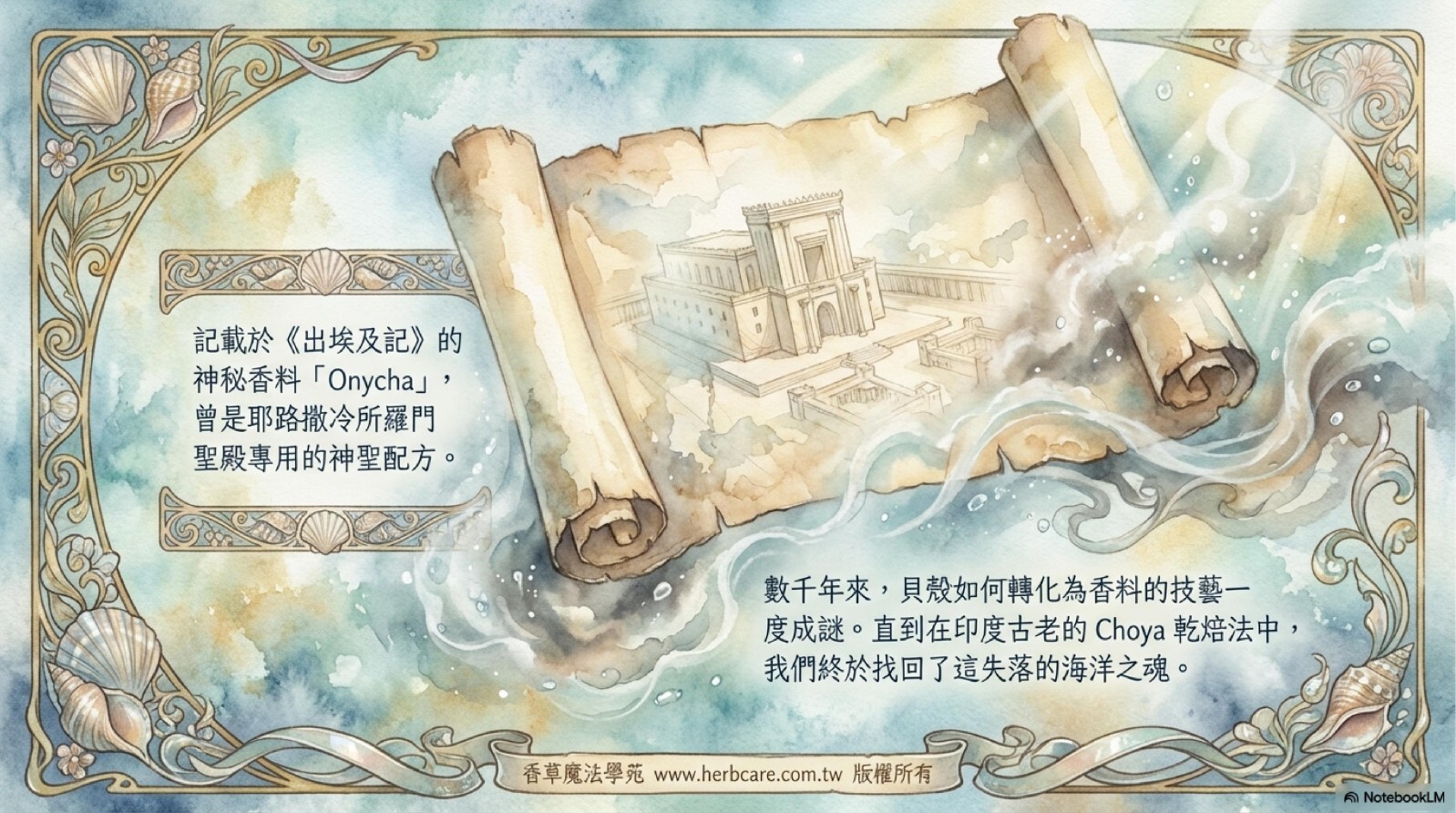 更厲害的是,這種香料最早的記載於出埃及記,記載了「用onycha以及乳香等調配出的珍貴香料,只能在耶路撒冷所羅門聖殿中使用,也只能用這個神聖配 方」。可惜的是該書中並無記載當時人是怎麼提煉出的,而貝殼怎麼變成了香料與定香的來源也無人得知,直到今日我們才從印度的Choya乾焙法中找到答案。