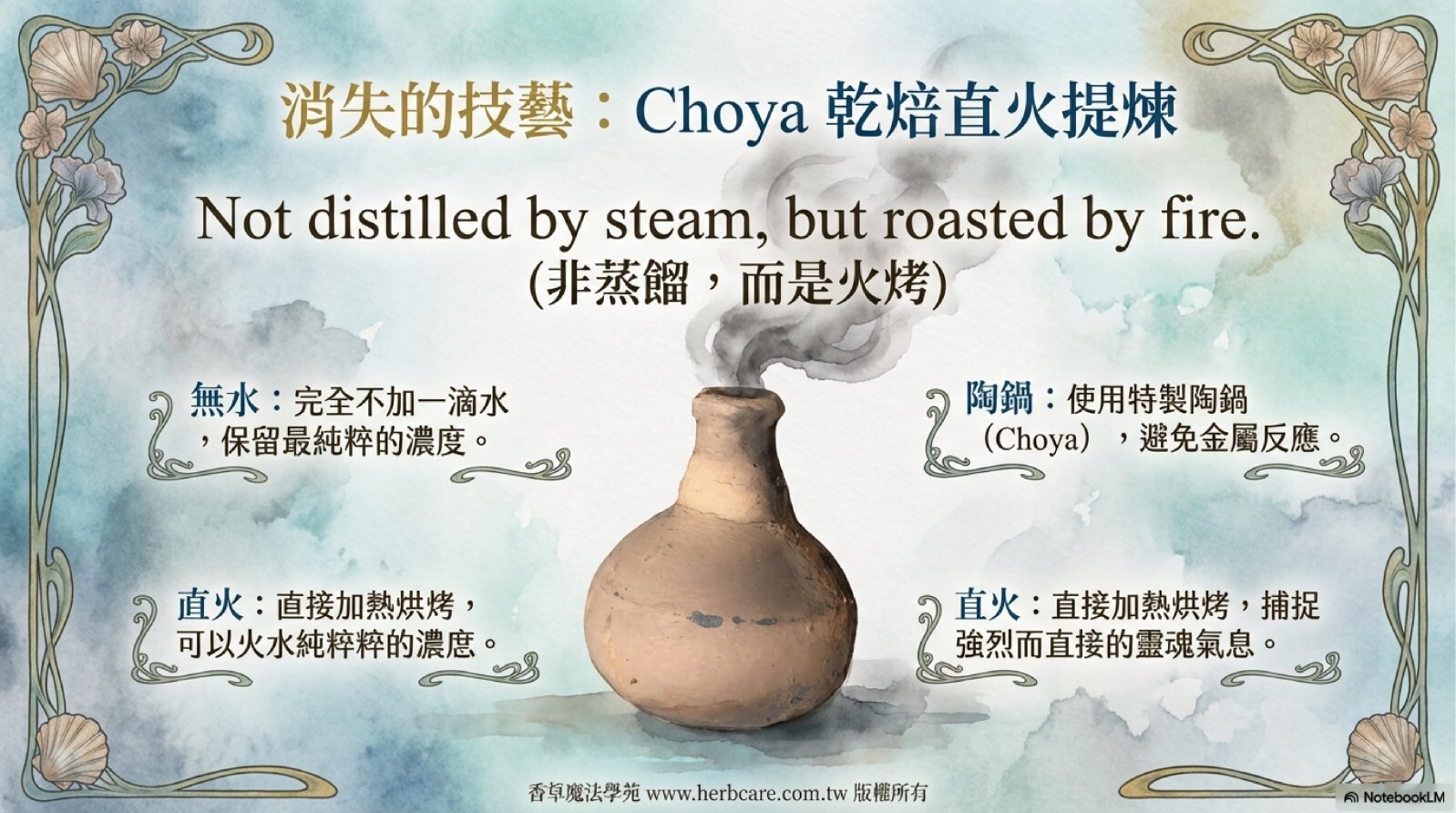 如果說attar是印度提煉精油古法中最稀有的,那「乾焙提煉」,又稱為無水提煉、破壞性蒸餾、直火提煉(Dry Distillation)可以說是更稀有的精油提煉法了。印地語Choya就是指的這種提煉法提煉出的精油,目前已知的也只有三種:Choya Loban、Choya Ral、Choya Nakh,對於深度精油迷來說,一定想知道這是甚麼?有什麼獨特之處?