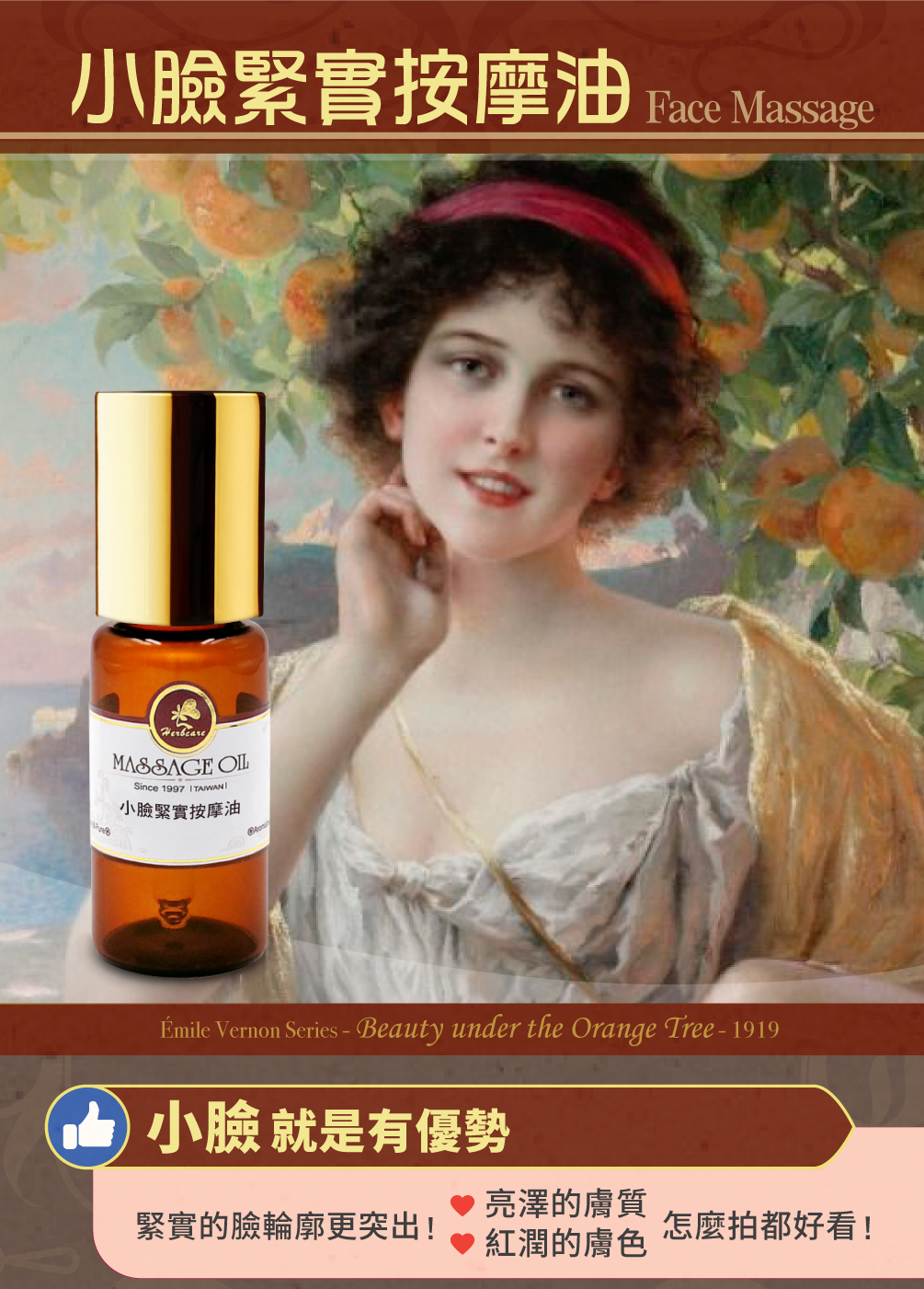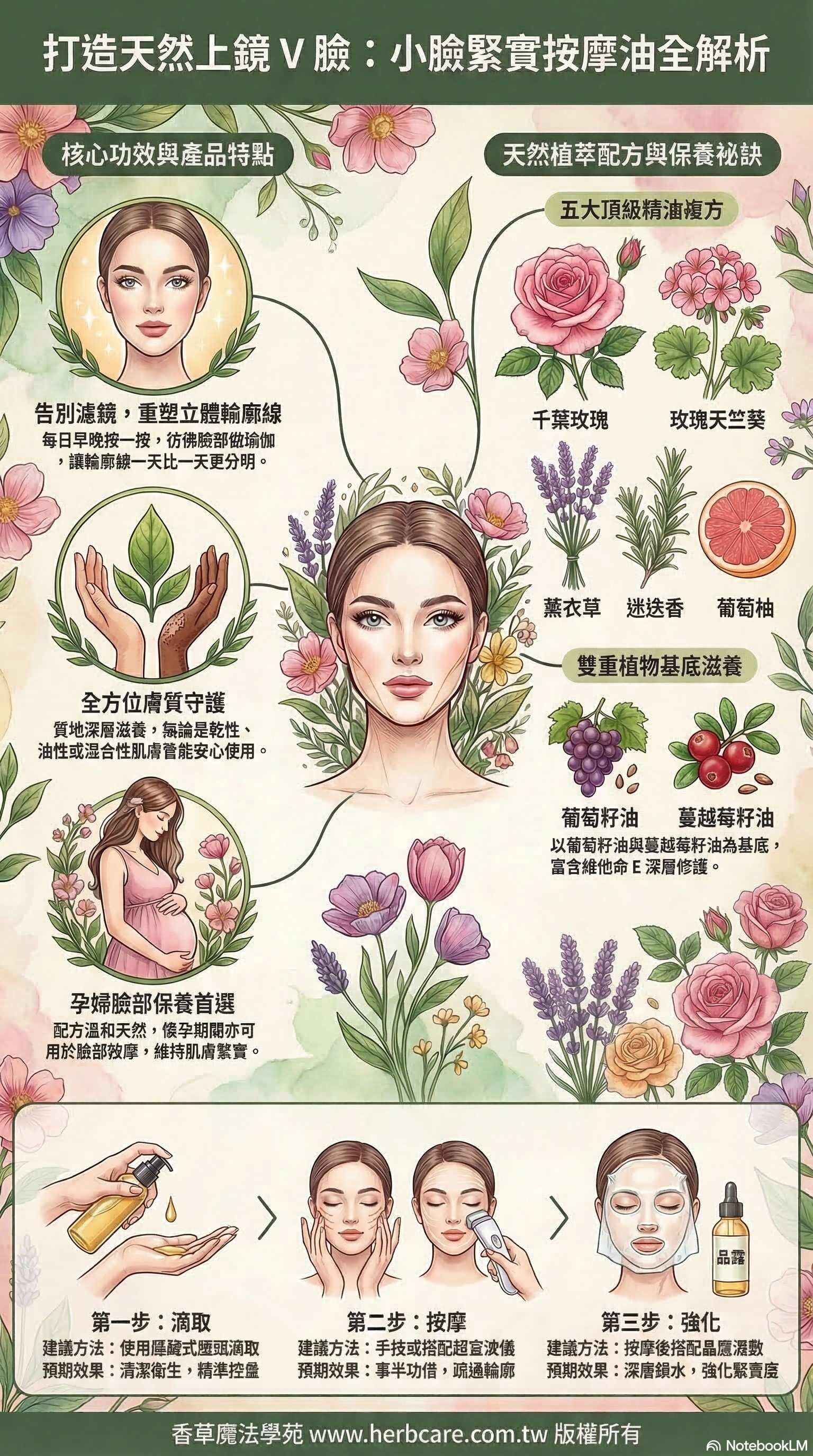 不用濾鏡,也能擁有上鏡小臉!小臉緊實按摩油,含有頂級保養成分千葉玫瑰精油,以及玫瑰天竺葵、薰衣草、迷迭香、葡萄柚精油,輔以葡萄籽油、蔓越莓籽油深層滋養。早晚按一按,彷彿臉部做瑜伽,感受輪廓線一天比一天更加分明,像久違的精緻鵝蛋臉說嗨!