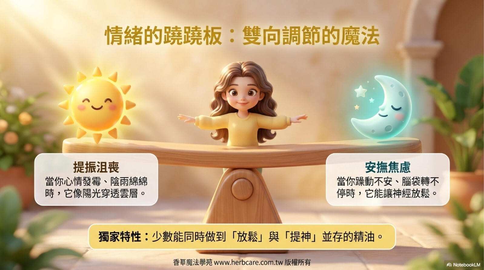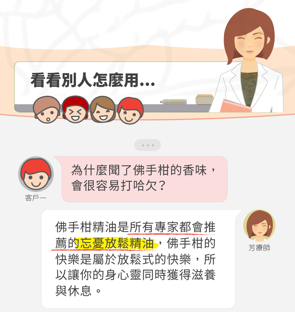 | A1: 佛手柑精油的香氣成分乙酸芳樟酯與芳樟醇,被認為與提升情緒、舒緩焦慮有關。聞到它的香氣,就像是在陰天裡看見了陽光,自然而然就感到心情愉悅。 |