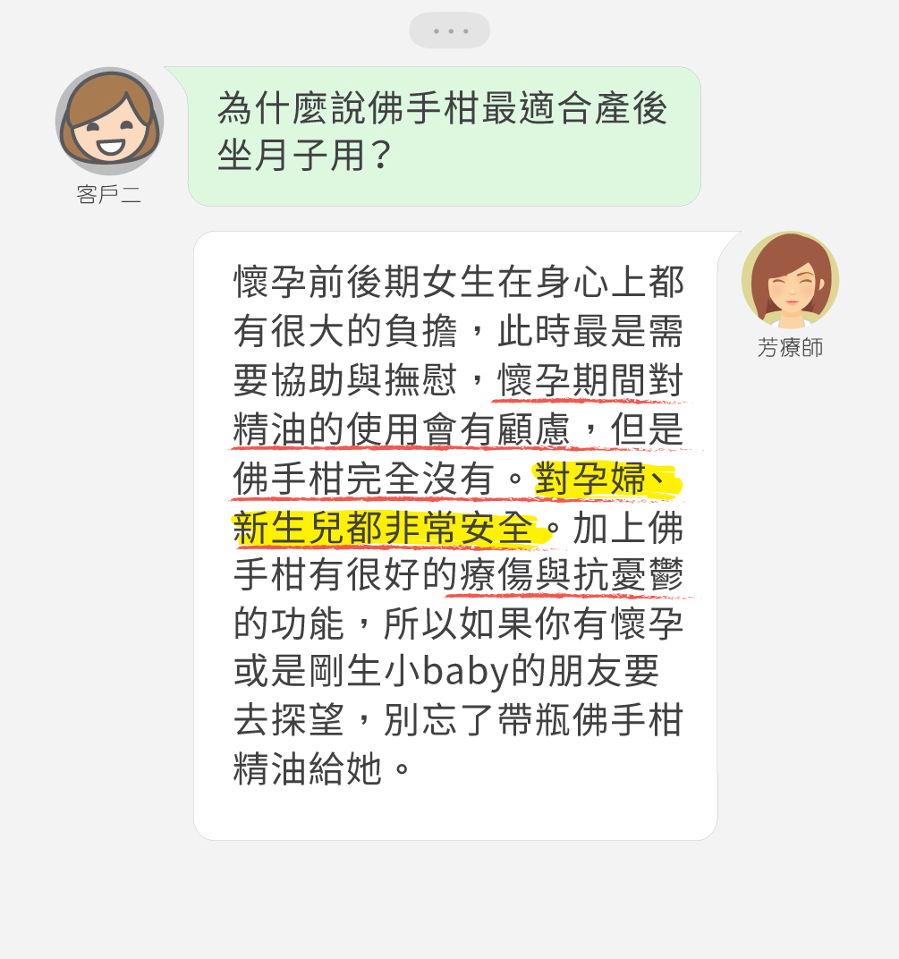 | A4: 佛手柑精油具有平衡身心的作用,溫柔的香氣能幫助安撫煩躁、焦慮的情緒。你可以在例假期前後用它來擴香,給自己一個溫柔的呵護。 |