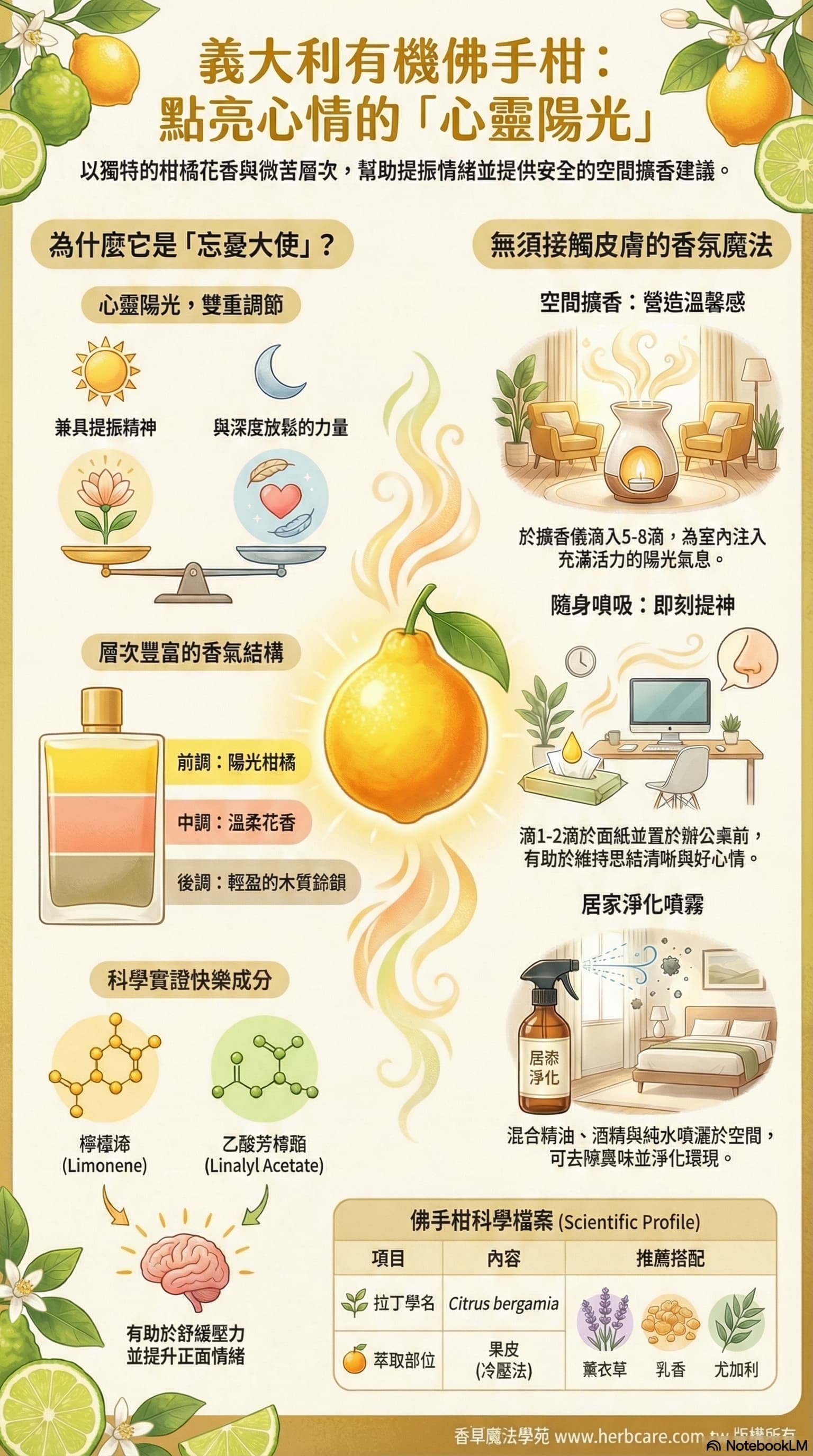 | Q1: 為什麼佛手柑精油又被稱為「心靈陽光」? |