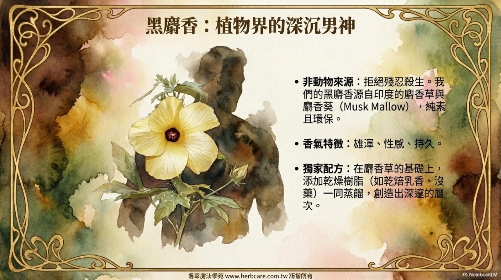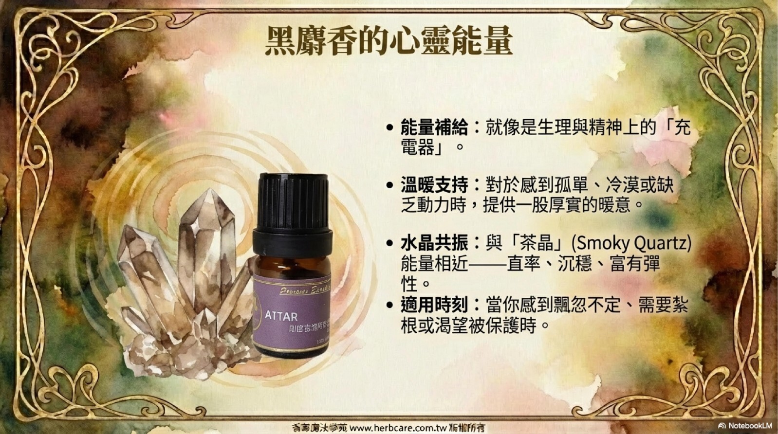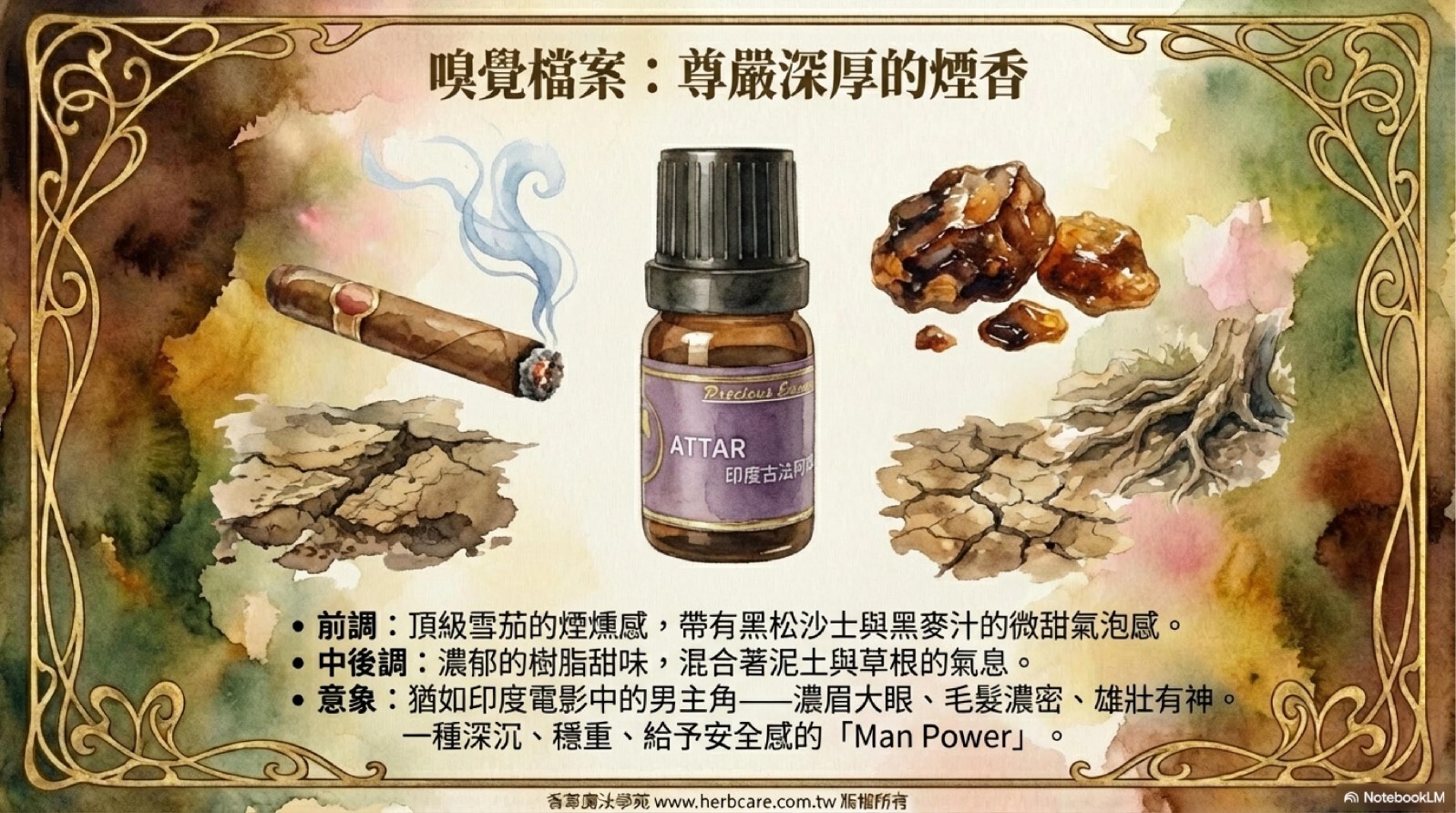 黑麝香attar在提煉時,是以印度麝香草為基礎,加上獨特的配方材料,一起添在Attar的提煉鍋爐中提煉出來才有如此複雜豐富的香味。像極了頂級雪茄那種舒服,尊嚴深厚的煙香,香味表現了累積的經驗與智慧。
