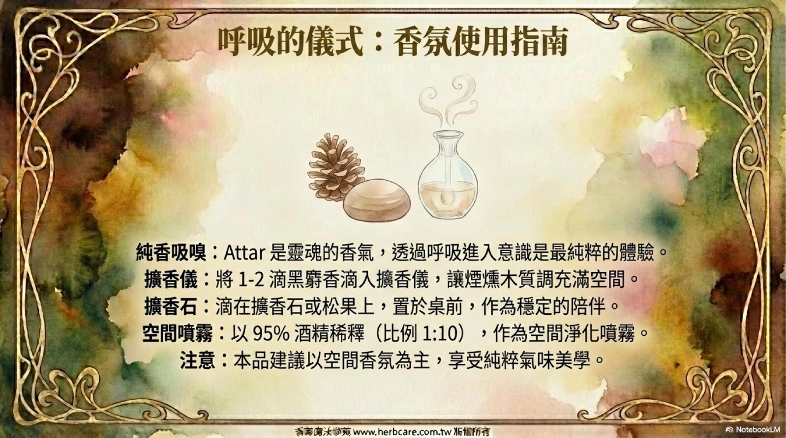 所以你當然可以把阿塔精油做為妳的精油配方,同時因為阿塔精油留香度非常高,也都有非常棒的功效,你可以把它想成是精油配方的升級版,不管作為按摩、擴香,或是其他你常用的精油用途,只要你捨得(因為阿塔精油價格都不便宜),它絕對讓你的芳療享受更上一層樓。