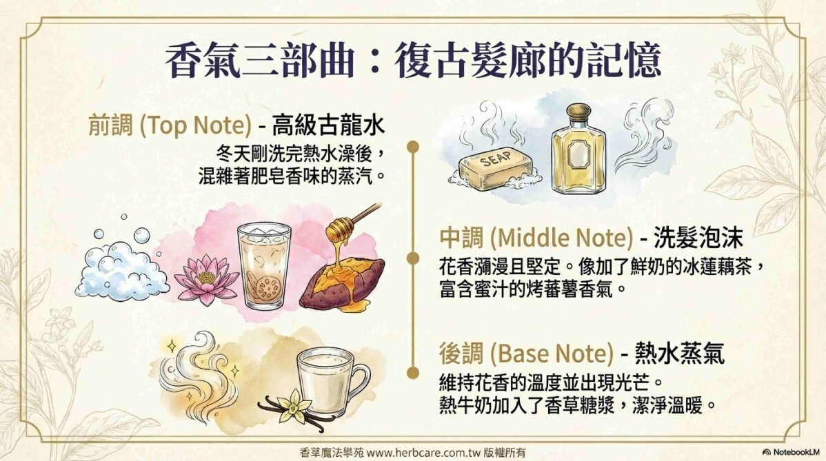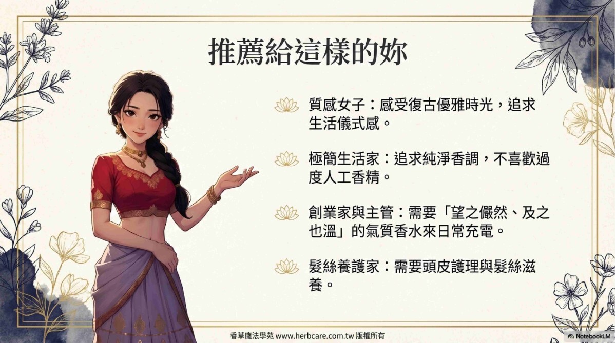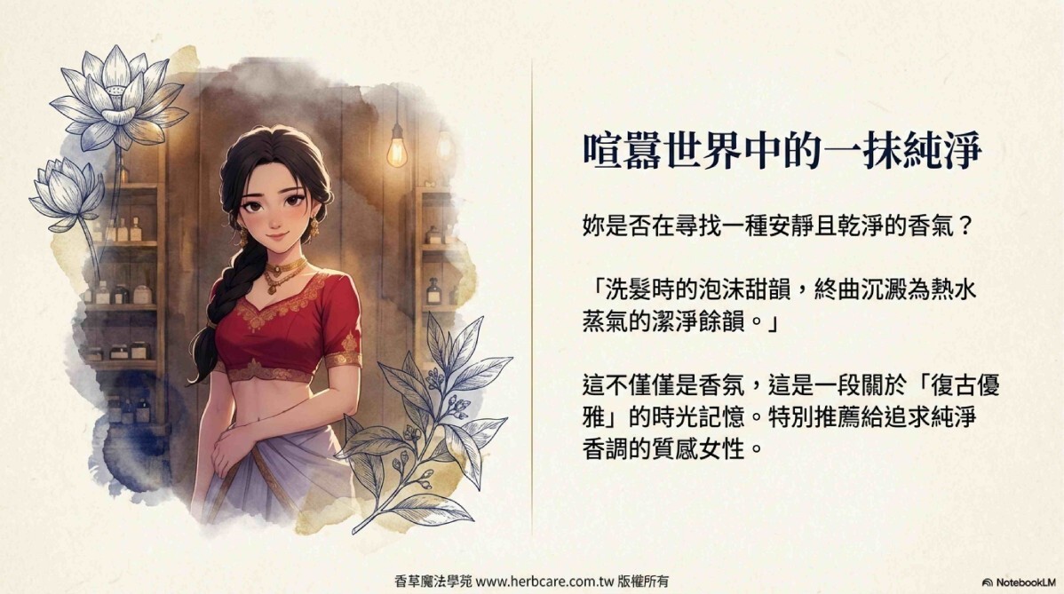 遵循印度千年Attar蒸餾工藝,採集黎明初綻藍蓮花瓣, 洗髮時的泡沫甜韻,終曲沉澱為熱水蒸氣的潔淨餘韻,安靜且乾淨的香氣,特別推薦給追求純淨香氛的質感女性。