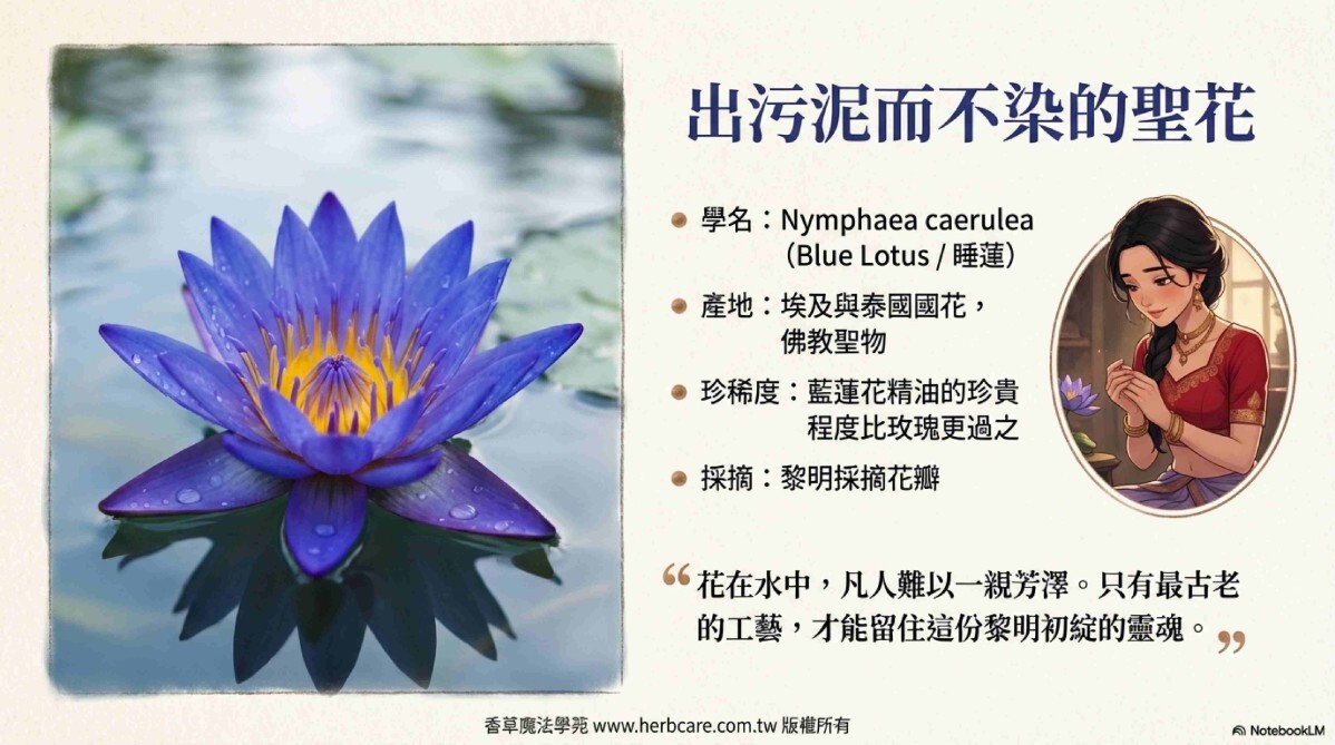 藍蓮花也就是我們熟悉的睡蓮,細緻婉約的柔香,前味類似低調的麝香與動情香,到中味開始花香瀰漫且堅定,後味維持花香的溫度並出現光芒,感應強的人閉眼可見藍色的花瓣與黃色的花蕊。藍蓮花不但是佛教的聖花,也是泰國、埃及的國花。
