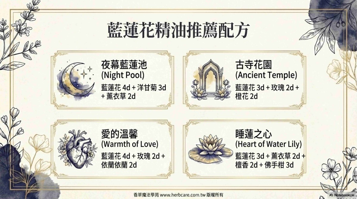 | 夜幕藍蓮池 | 藍蓮花Attar精油4d+洋甘菊精油3d+薰衣草精油2d |