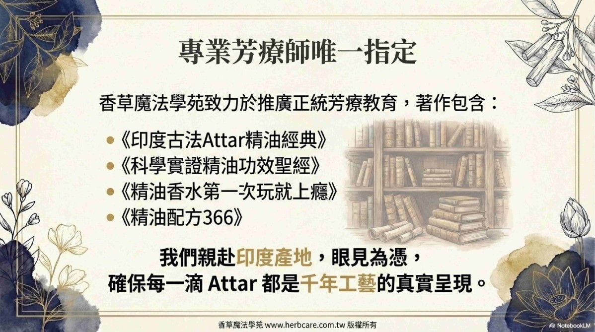 所以你當然可以把阿塔精油做為妳的精油配方,同時因為阿塔精油留香度非常高,也都有非常棒的功效,你可以把它想成是精油配方的升級版,不管作為按摩、擴香,或是其他你常用的精油用途,只要你捨得(因為阿塔精油價格都不便宜),它絕對讓你的芳療享受更上一層樓。
