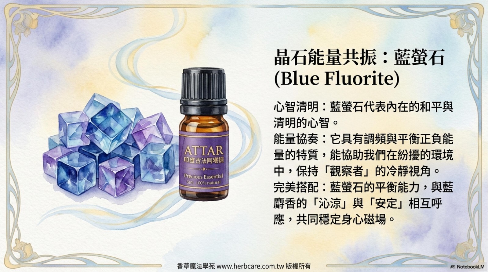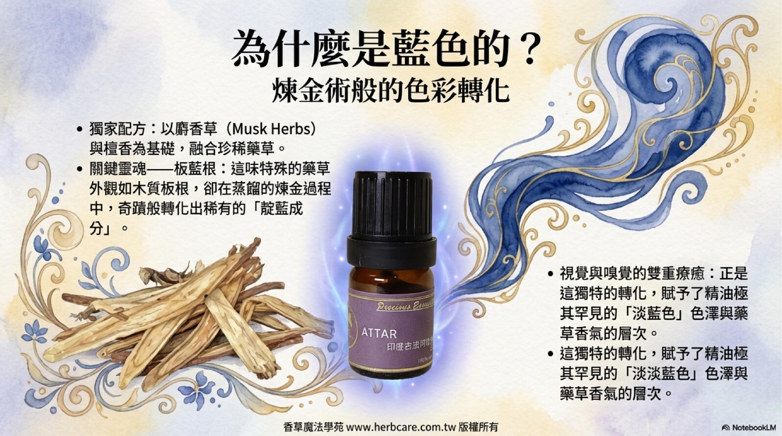 稀有的藍麝香,它的顏色是淡藍色,這是因為除了麝香草的基礎外,又多加了些藥草類的材料,其中有一味『板藍根』,這種藥材外觀為銀杏樹那種板根, 但是在提煉的過程中會轉化出靛藍成分,因此精油呈現淡藍色。