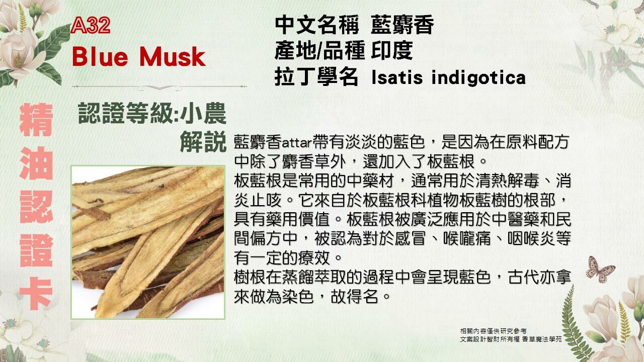 稀有的藍麝香,它的顏色是淡藍色,這是因為除了麝香草的基礎外,又多加了些藥草類的材料,其中有一味『板藍根』,這種藥材外觀為銀杏樹那種板根, 但是在提煉的過程中會轉化出靛藍成分,因此精油呈現淡藍色。