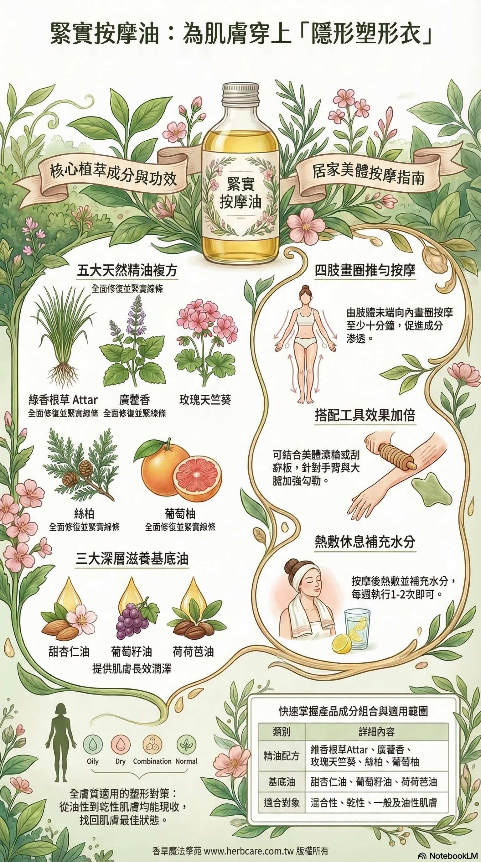 試試為肌膚穿上隱形的塑形衣!以綠香根草attar精油、廣藿香、玫瑰天竺葵、絲柏、葡萄柚等天然精油,再搭配甜杏仁油、葡萄籽油、荷荷芭油的完美基底,帶來深層滋養,每一滴都在為你的線條注入活力,讓肌膚重回最佳狀態!從手臂到大腿,輕輕打圈推勻,像畫筆在肌膚上勾勒,配合適當壓力,讓成分更深層滲透。還可搭配美體滾輪或刮痧板,效果加倍。