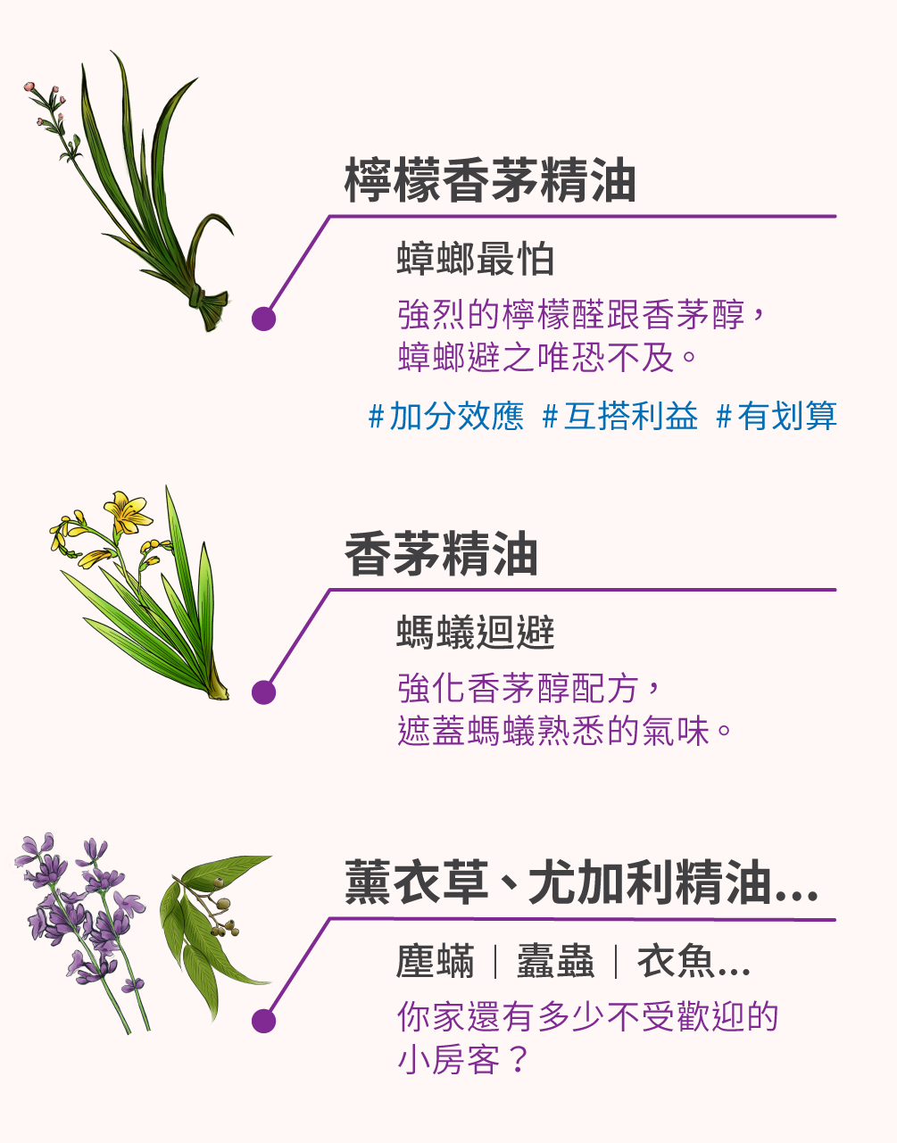 其他:薰衣草、尤加利...提供好的植物香味,讓小蟲知難而退。