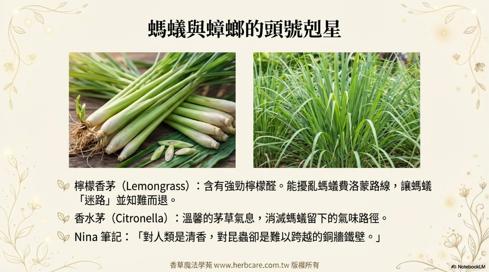 螞蟻,香茅含有植物的香茅醇精華,它能消滅螞蟻故意留下的氣味,螞蟻在你家的一帶一路,立刻消滅。