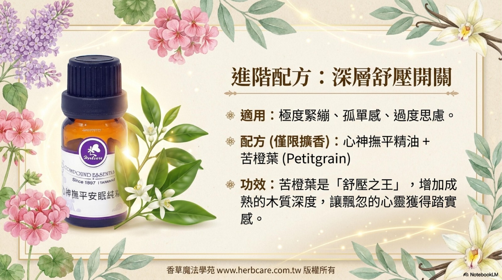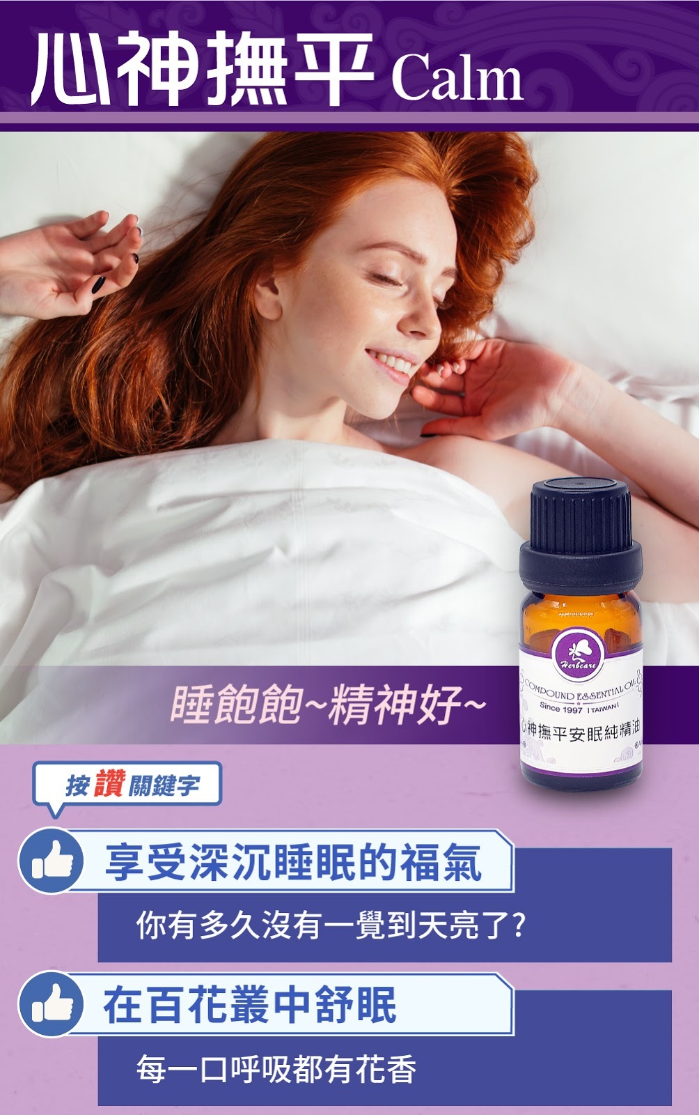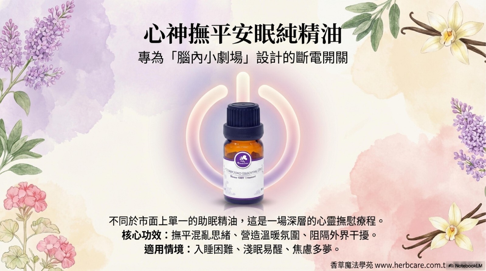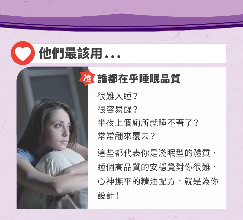 淺眠?易醒難回睡?翻來覆去睡不著?身體累了,心卻停不下來?心神撫平安眠純精油,幫你關掉腦內小劇場!由代表幸福的洋甘菊精油,與代表平靜的薰衣草精油,代表溫暖的玫瑰天竺葵精油等複方組合,提供您幸福與安全感,適合難以入睡者,作為入寢時最佳的氛圍與呵護。