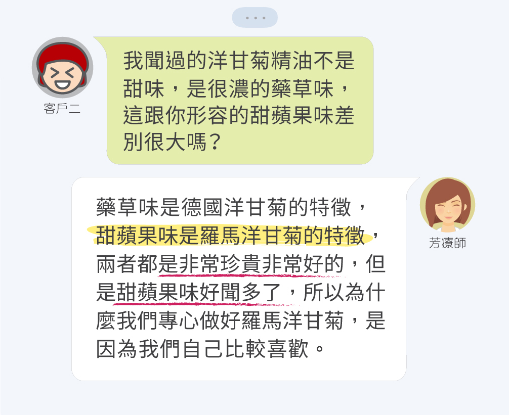 洋甘菊精油,其香甜濃郁的味道,大人小孩都喜愛的接近蘋果蜜的香氣,不但給人精神上的放鬆還有種幸福的愉快感,是相當珍貴也絕對值得的精油。