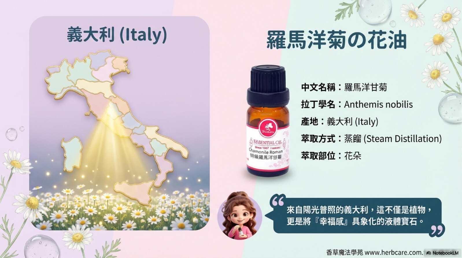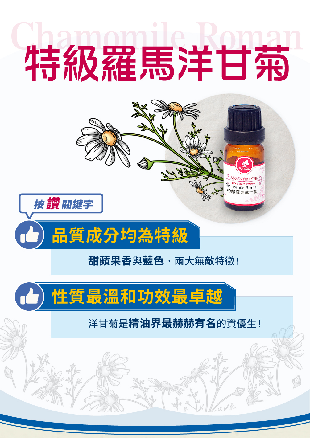 特級羅馬洋甘菊精油,市面上極罕見的深綠偏藍色,富含稀有抗過敏物質珍貴天藍烴植物精華使然,才稱得上特級,亦有「最溫柔的美肌聖品」之稱,可取代德國洋甘菊保養使用。香氣為大人小孩都喜愛的香甜濃郁蘋果蜜香,賦予精神上的深度放鬆以及幸福愉悅感,常用於放鬆舒眠。學苑鎮站之寶特級洋甘菊精油是相當珍貴也絕對值得的精油。