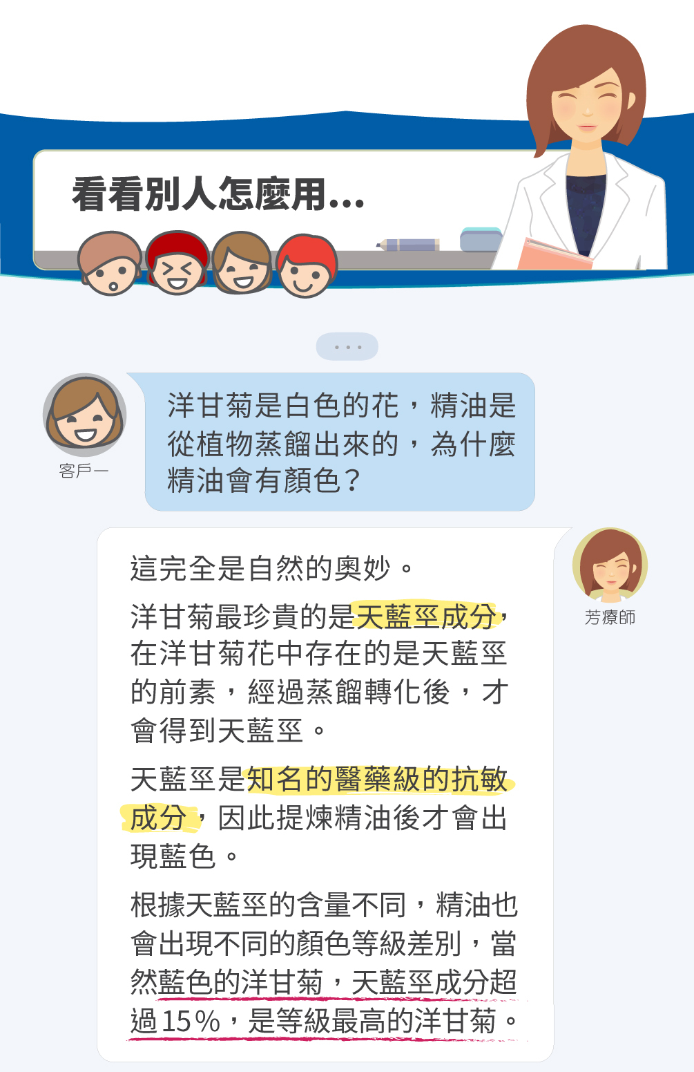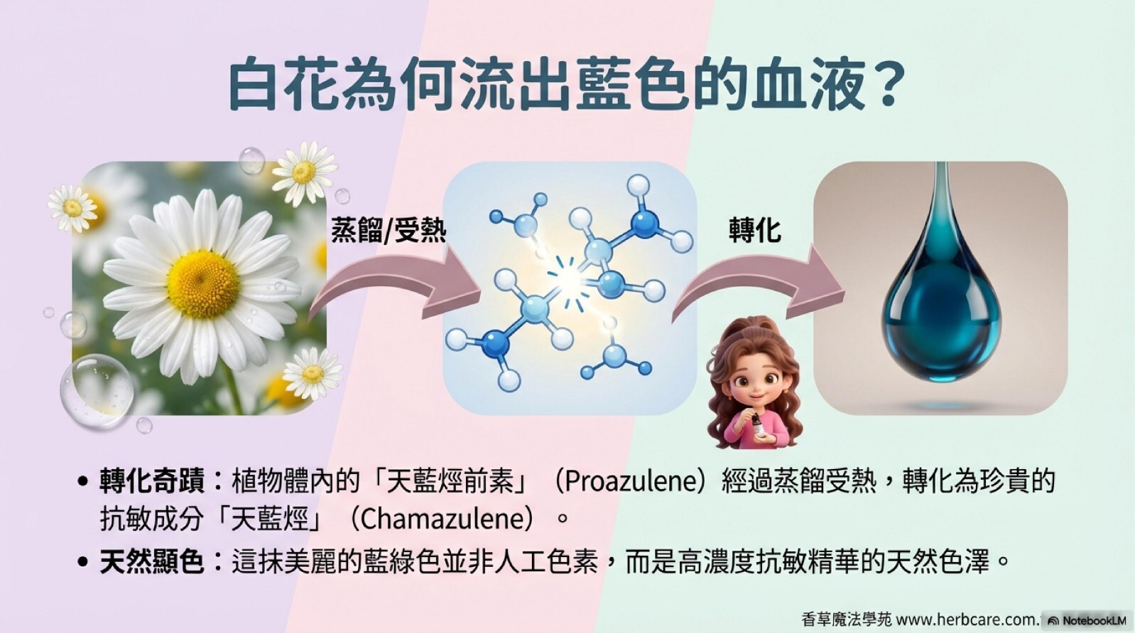 所周知,洋甘菊的花朵是白色,那麼洋甘菊精油的顏色為何是藍色或綠色呢?原因是洋甘菊花朵本身存在“天藍巠前素”,在蒸餾的過程中,產生天藍巠,這是知名的消炎抗敏成分,洋甘菊精油的功效也主要視其成分的濃度。