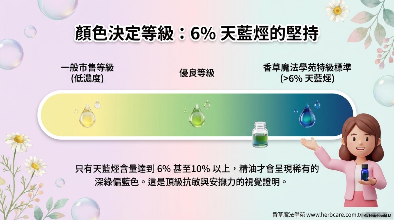 天藍巠的濃度比例不夠,精油呈現淡黃色,天藍巠濃度較高,會偏向黃綠色,甚至綠色,天藍巠達10%以上,可以呈現藍色,甚至深藍色。
