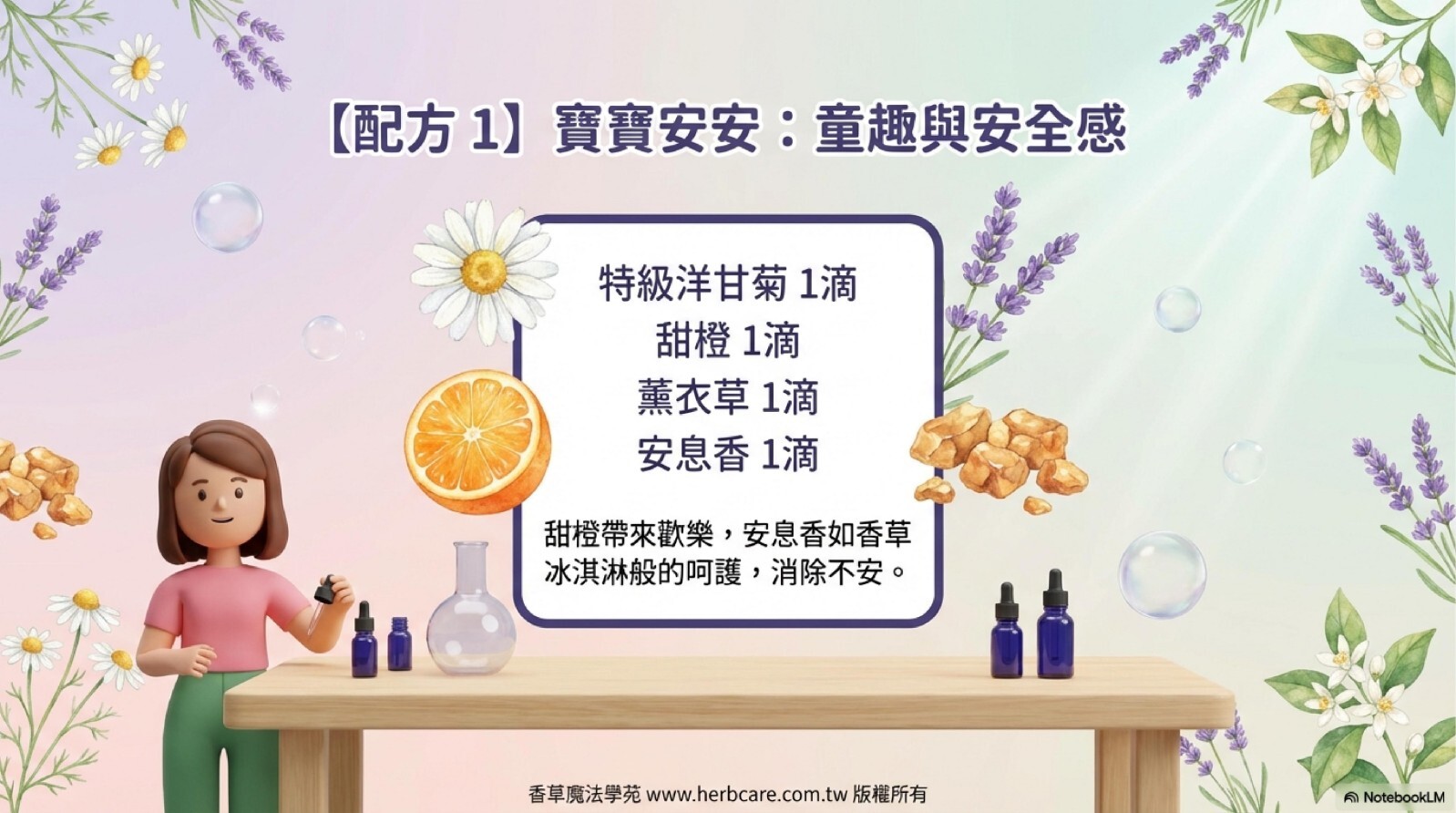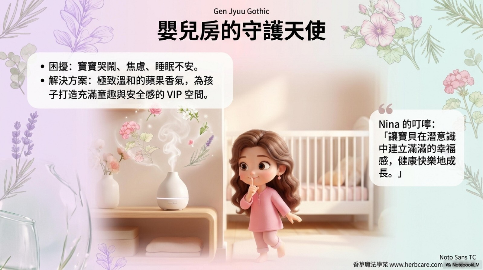 洋甘菊甜美幸福的特徵,可以做為寶寶香水或是嬰兒房的香氛,讓您的寶貝在潛意識中就能獲得幸福感與滿足快樂,這對健全他的人格發展有非常棒的助益。