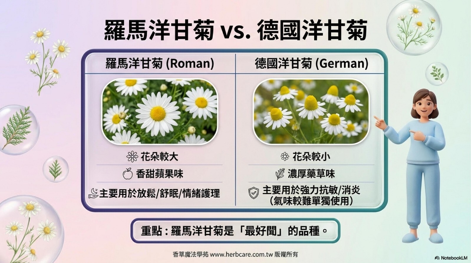 羅馬洋甘菊氣味好聞些,顏色偏黃表示品質一般,偏綠表示不錯,偏藍表示難得,德國洋甘菊通常為藍色,品質穩定。