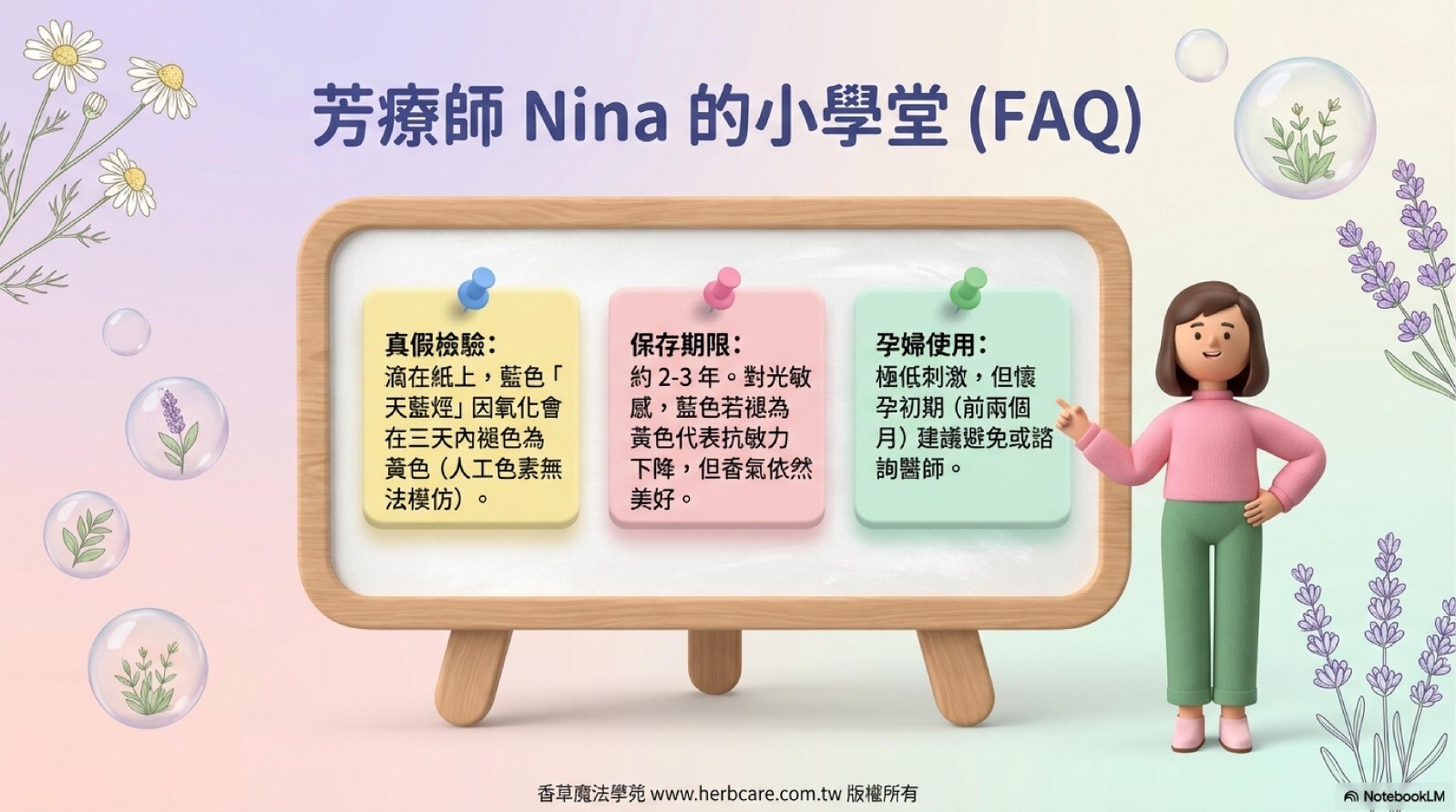 保存期限約為2到3年,如能合適的保存可以存放更久。因天藍巠對光照與揮發更敏感,故保存時更要注意。如洋甘菊藍色退去變成黃色,其香味還是很好的香氛感受,只是抗敏成分與功效可能打折。