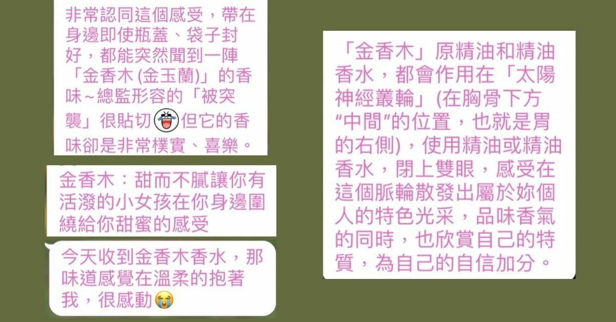 金香木是極稀有且尊貴的attar精油,香味為穿透力強且明亮的花香,能量強前味強,甜美愉快的中味接著徐徐而來,眼前彷彿可見金黃色的花瓣嬌鮮欲滴,是一種能聞出貴氣的花香。金香木只能用attar提煉法才可能獲得完美的香氣提煉。