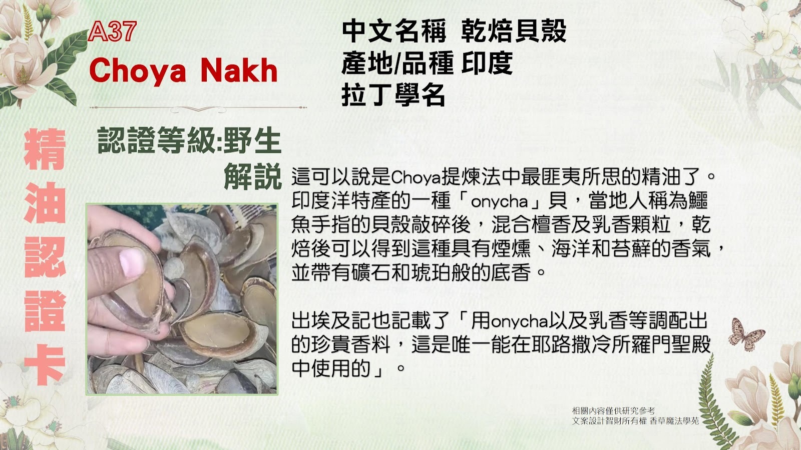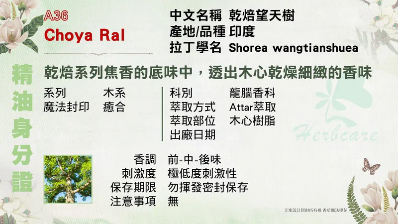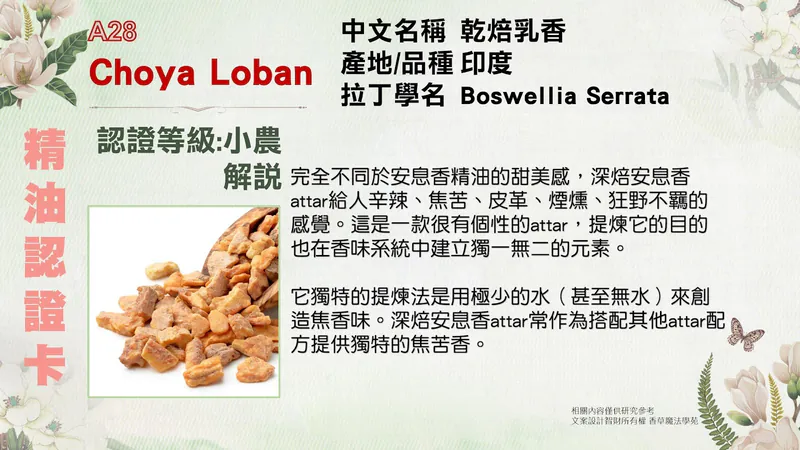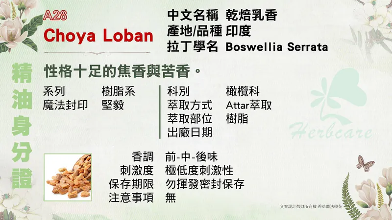 這裡用的乳香是印度乳香又稱為齒葉乳香(Boswellia Serrata),這種特產於印度的乳香,與其他乳香(阿曼乳香,阿拉伯乳香...)在香味上、成分上都有不同,且能量非常強。用Choya提煉時,不需 要檀香基底油,只要把乾燥的印度乳香放入陶鍋中加熱,就可以得到Choya Loban。這個精油最獨特的用途在於處理創傷,皮膚的以及心靈的。