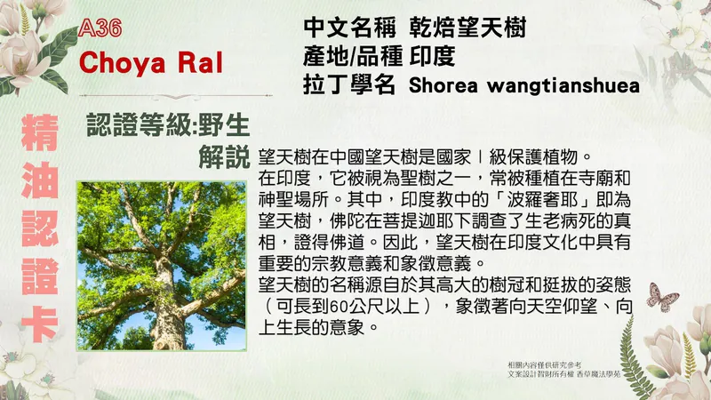 望天樹的名稱源自於其高大的樹冠和挺拔的姿態(可長到60公尺以上),象徵著向天空仰望、向上生長的意象。望天樹在身心靈層面,被視為具有穩定情緒、增強意志力和內心堅定的作用,有助於平衡身心靈。而利用其樹脂以及Choya乾 焙法提煉的精油,也是在身心靈上及宗教上有其獨特的功效。
