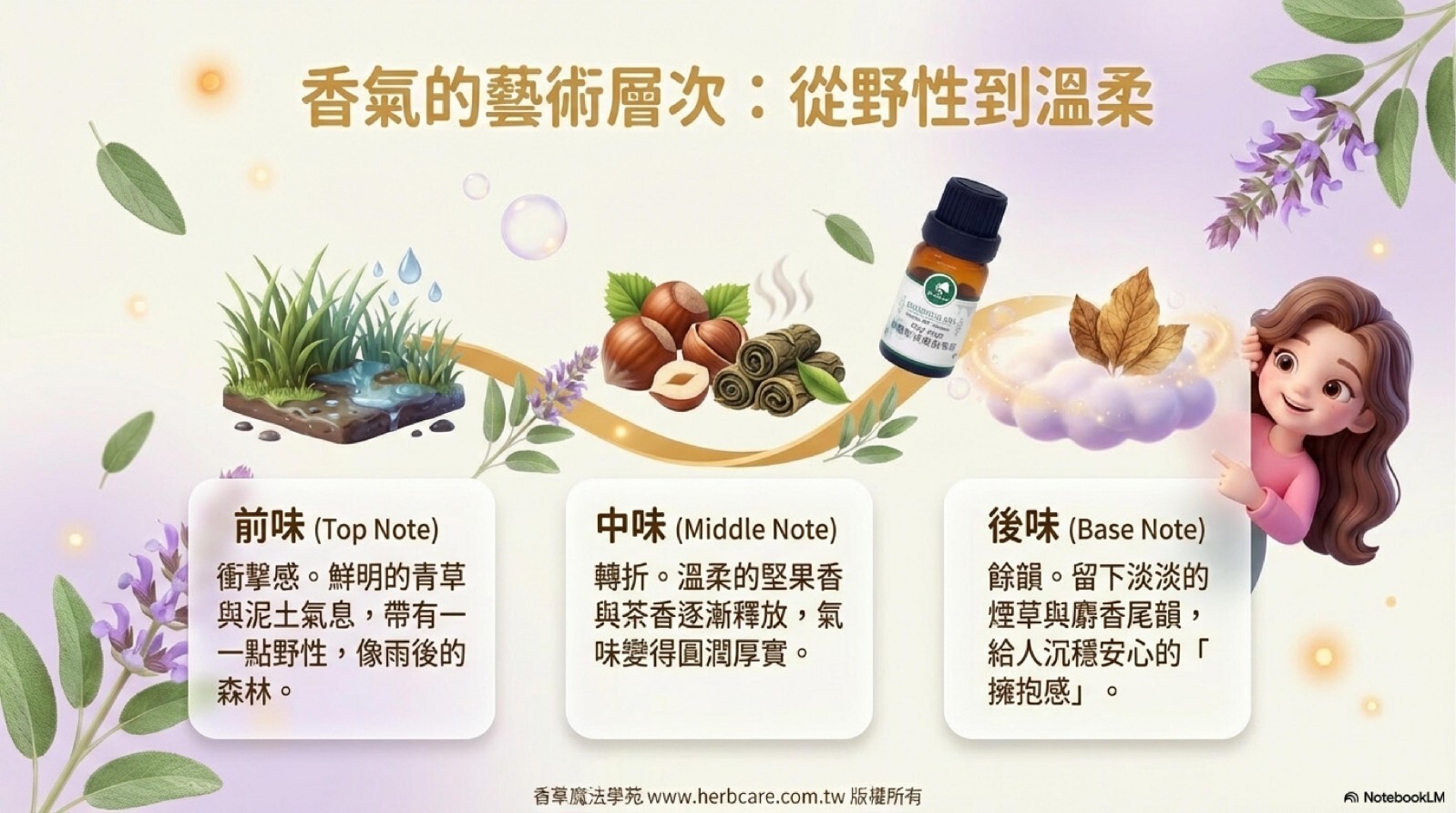 快樂鼠尾草的香氣層次豐富,充滿了溫柔而甜美的花草氣息。