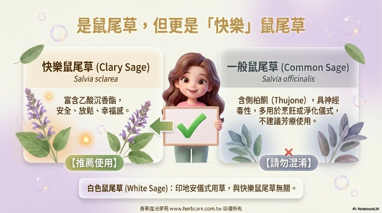 | 種類/品種差異 | 快樂鼠尾草與一般用於烹飪的鼠尾草(Common Sage)是不同品種。快樂鼠尾草精油因富含乙酸沉香酯,氣味甜美而溫和,具有強大的安撫效果;而一般鼠尾草精油則帶有濃烈樟腦味,刺激性較高,適用於不同目的。 |