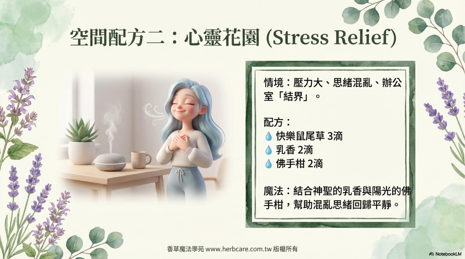 需求/時間點:當你感到情緒緊繃、心神不寧時,為自己創造一個寧靜的空間。