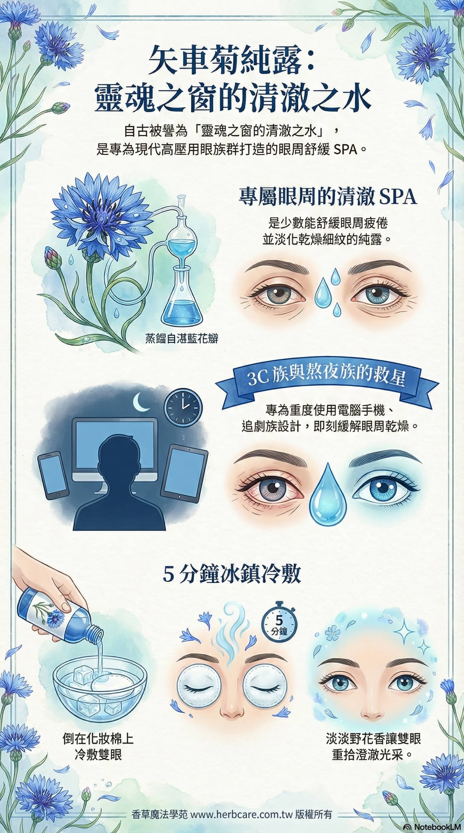 嚴選法國有機矢車菊,完整保留花青素+矢車菊素活性成分,香氣散發清新草本→蜂蜜甜香→雨後大地三重療癒層次,被歐洲芳療界譽為「液體藍寶石」。不只是純露,更像是一瓶為疲憊與敏感設計的香氣處方,不像華麗玫瑰那樣張揚,卻以最純粹的方式,輕輕安撫、深深滋養,讓你的眼神與膚質,同時回到最美的狀態。