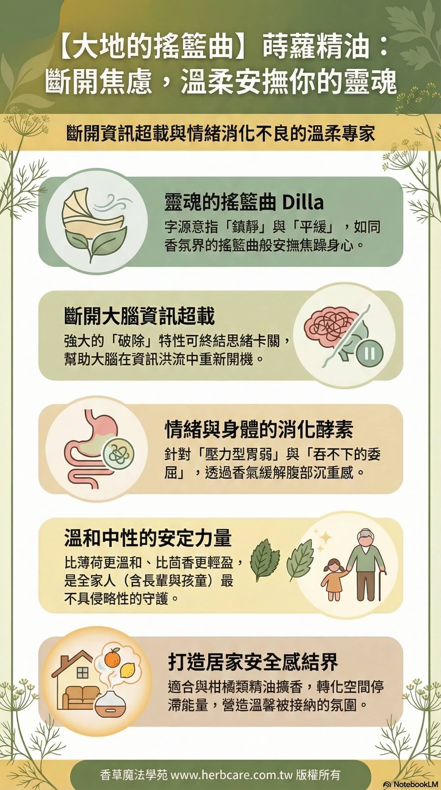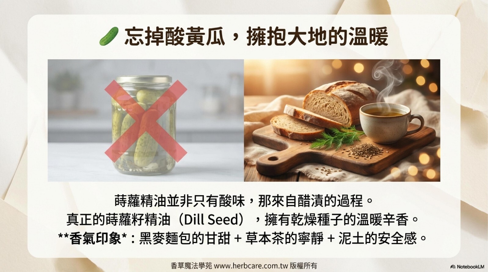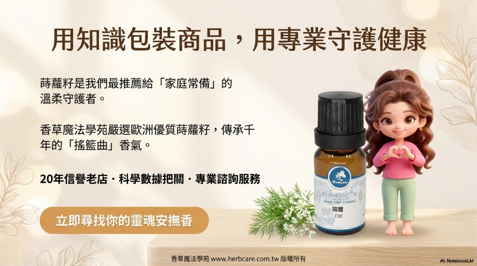 蒔蘿籽是我們最推薦給「家庭常備」的溫柔守護者。 香草魔法學苑嚴選來自歐洲的優質蒔蘿籽精油, 讓這股傳承千年的「搖籃曲」香氣,安撫家中每一個焦躁不安的靈魂。