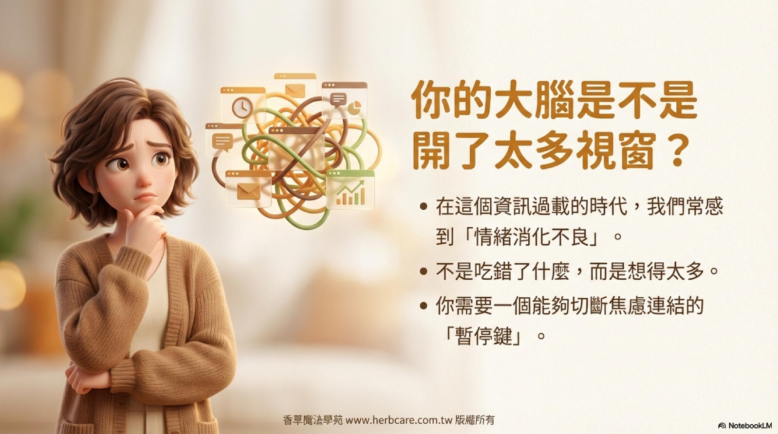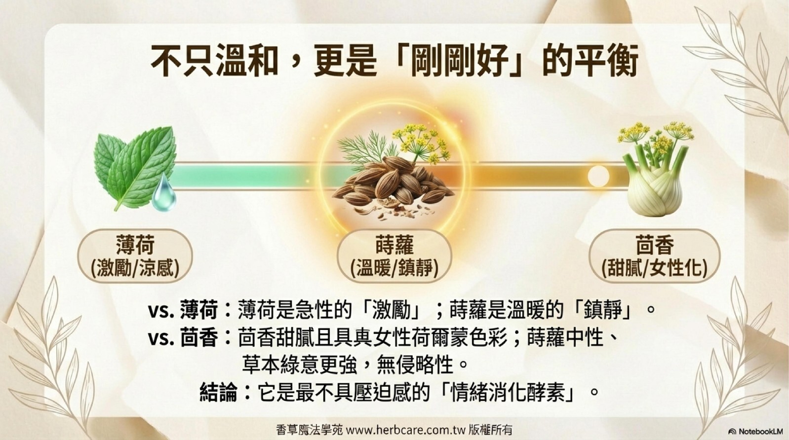 我們選用的是能量更飽滿的「蒔蘿籽 (Seed)」而非葉片。它比薄荷更溫和,比茴香更安全。對於因為緊張或是因為資訊量過載而混亂的大腦,蒔蘿都是最溫柔的解藥。