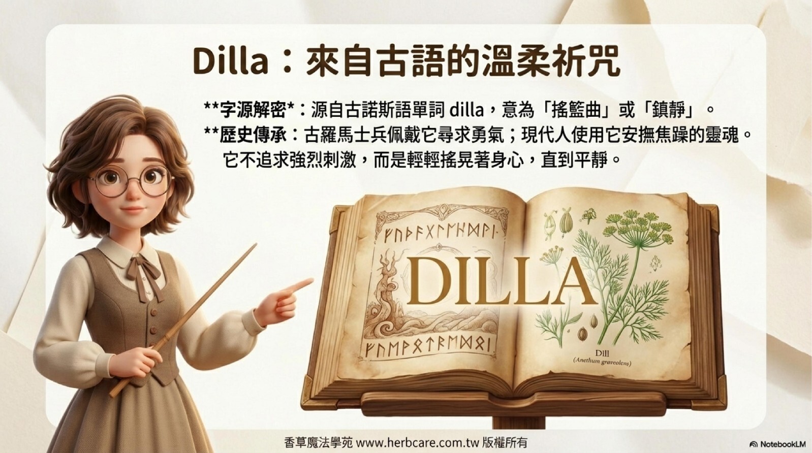 蒔蘿(Dill)的名字源自古諾斯語單詞 dilla,意思是「搖籃曲」或「鎮靜」。這完美詮釋了它的靈魂——它不追求強烈的刺激,而是用一種溫暖、草本且帶有微甜辛香的氣味,輕輕搖晃著焦躁的身心,直到平靜下來。