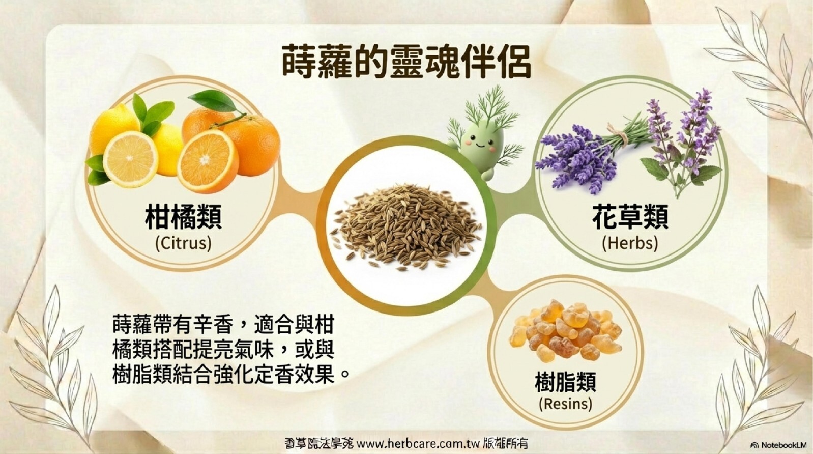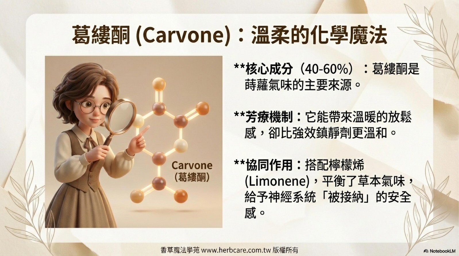 | Carvone (葛縷酮) | 40-60% | 核心成分! 它也是蒔蘿氣味的主要來源,能帶來溫暖的放鬆感。 |
