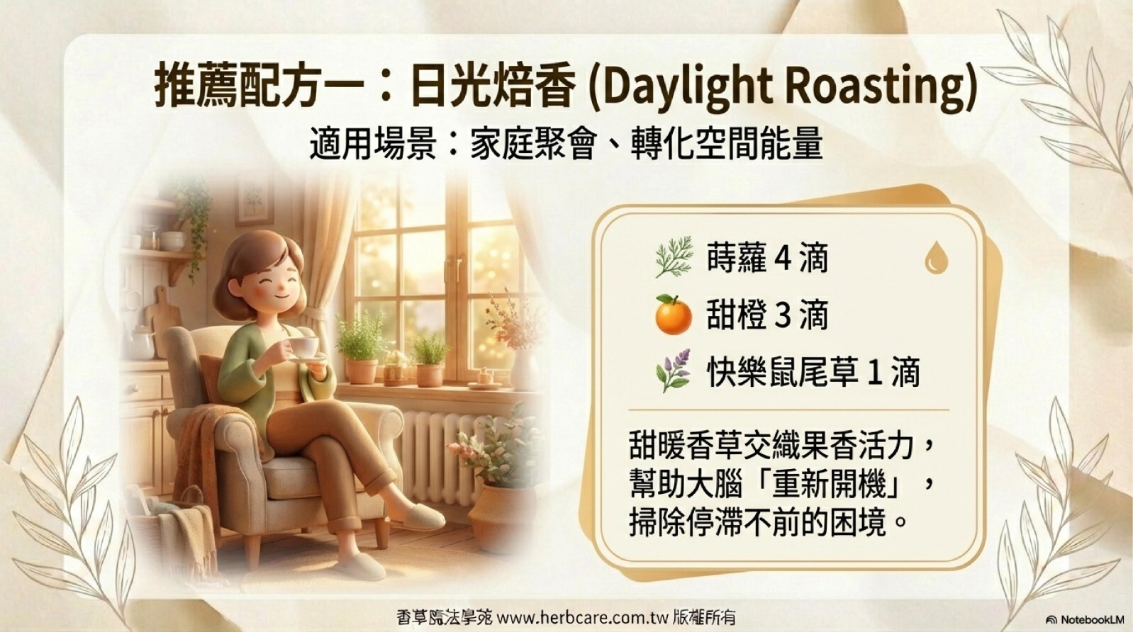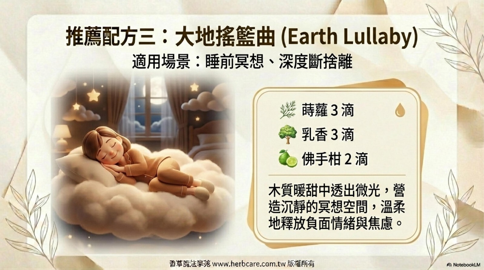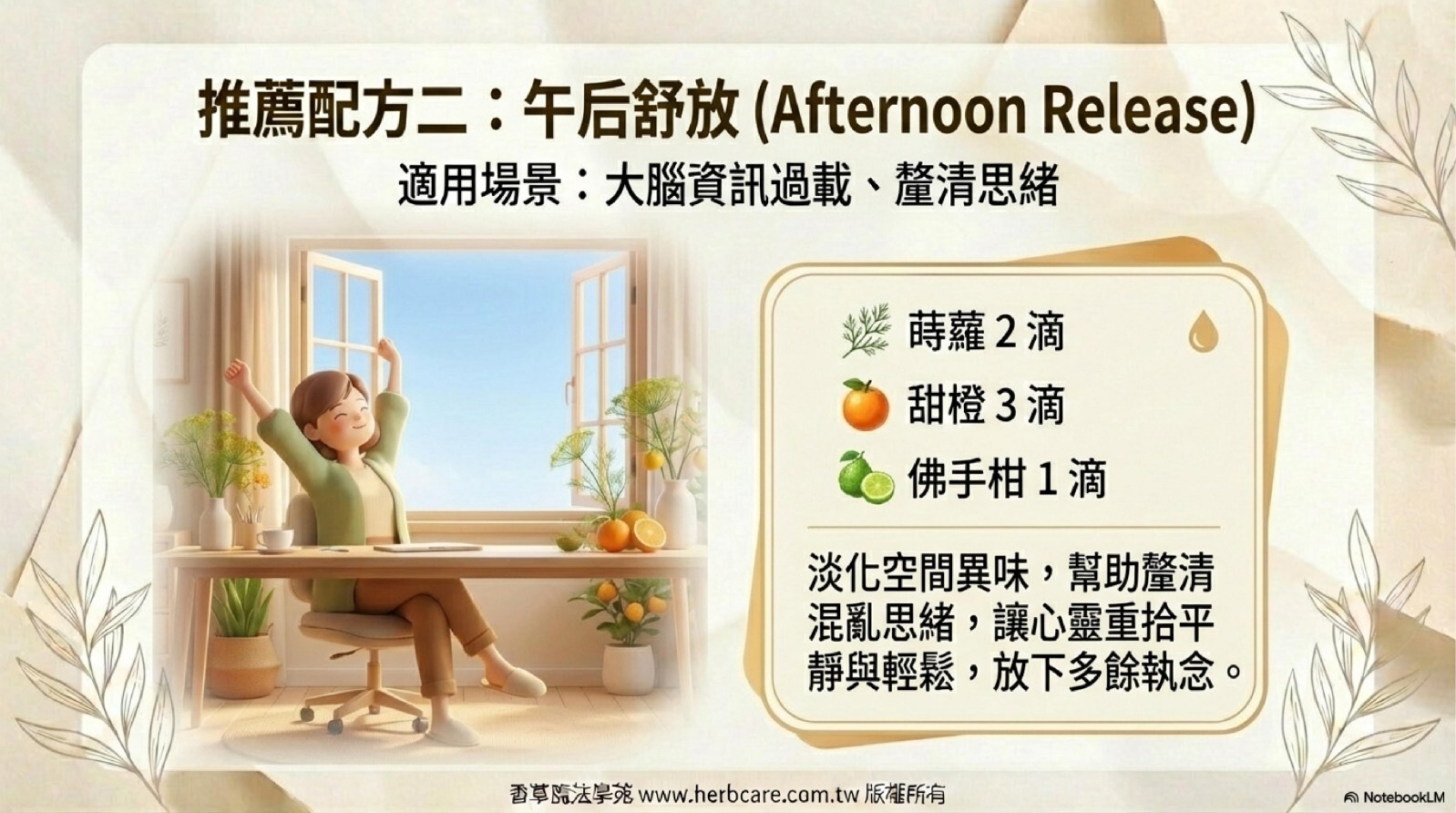 「將此配方用於水氧機擴香,能淡化空間異味,幫助釐清混亂思緒,讓心靈重拾平靜與輕鬆。」
