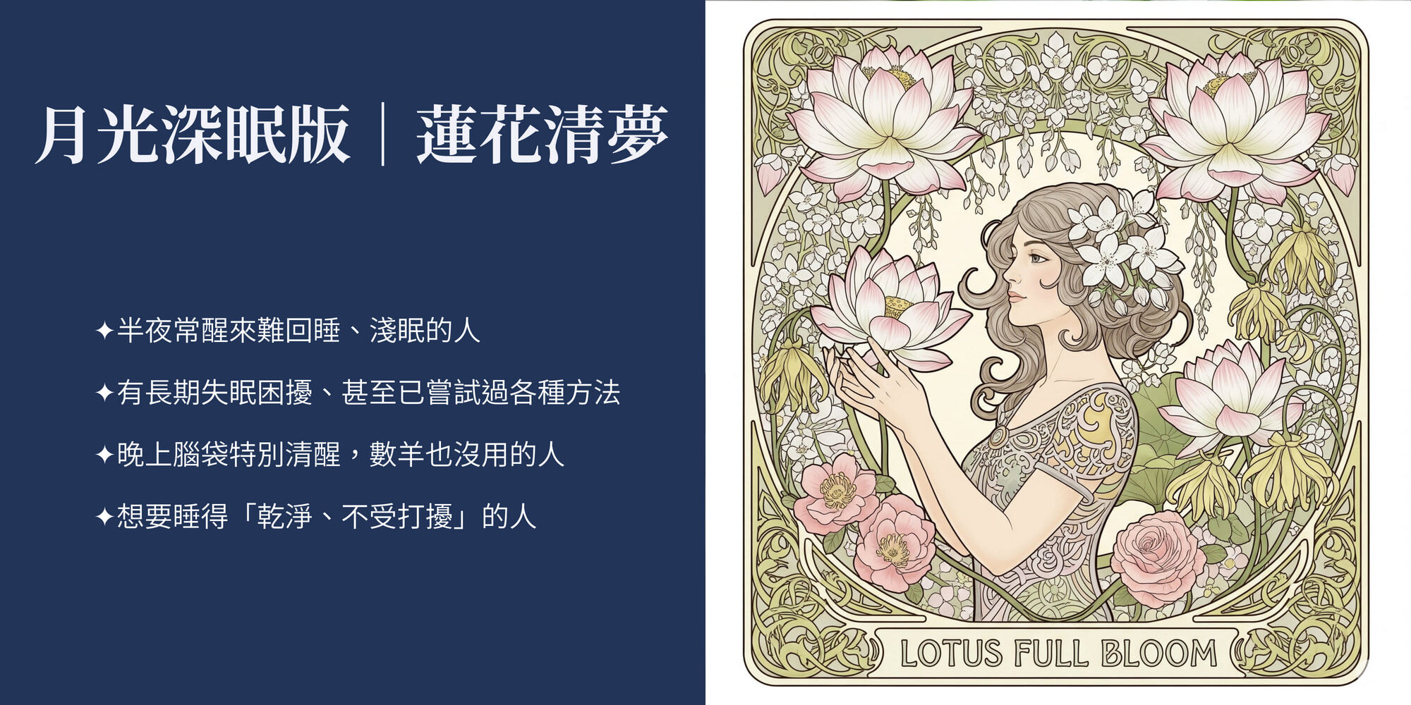 白蓮靜立池中,粉蓮輕輕盛放的清香像夜風拂面,雪松的沉穩讓心神安定,檸檬帶來清亮的呼吸感,心中躁動慢慢消散,夜裡第一次感覺「真正靜下來」。 給予銀髮族與長期失眠者最純淨的夢境陪伴,隔天清晨醒來,將發現身體不再疲累,心情也久違地輕盈。