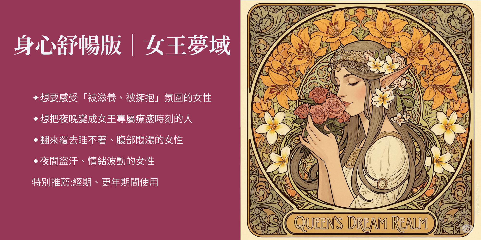 情緒反覆、夜晚難安的日子,噴上《女王夢域》,讓自己慢慢放鬆,能安心躺下,像女王般在屬於自己的夢境裡被守護。溫暖的藏紅花像是一盞小燈,驅走夜裡的不安;岩蘭草穩重的氣息讓心重新安定。緬梔的奶香與百合的幽靜,像一件厚實的披風,溫柔卻堅定地覆蓋在你身上。每一位女性,都能在夜裡重拾平衡與自信。