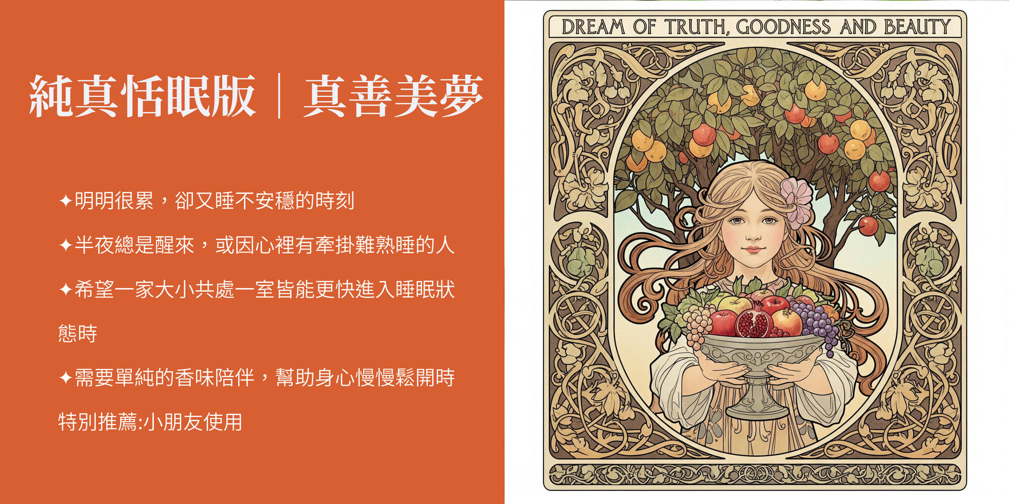 睡前在被子上輕噴《真善美夢》,不再害怕黑夜,安然地進入星星的懷抱。甜橙的快樂氣息,安息香的奶香,再加上綠香根草的安定,就像媽媽的懷抱。一呼一吸間,放下心裡的緊張,靜靜進入單純又甜美的夢境。