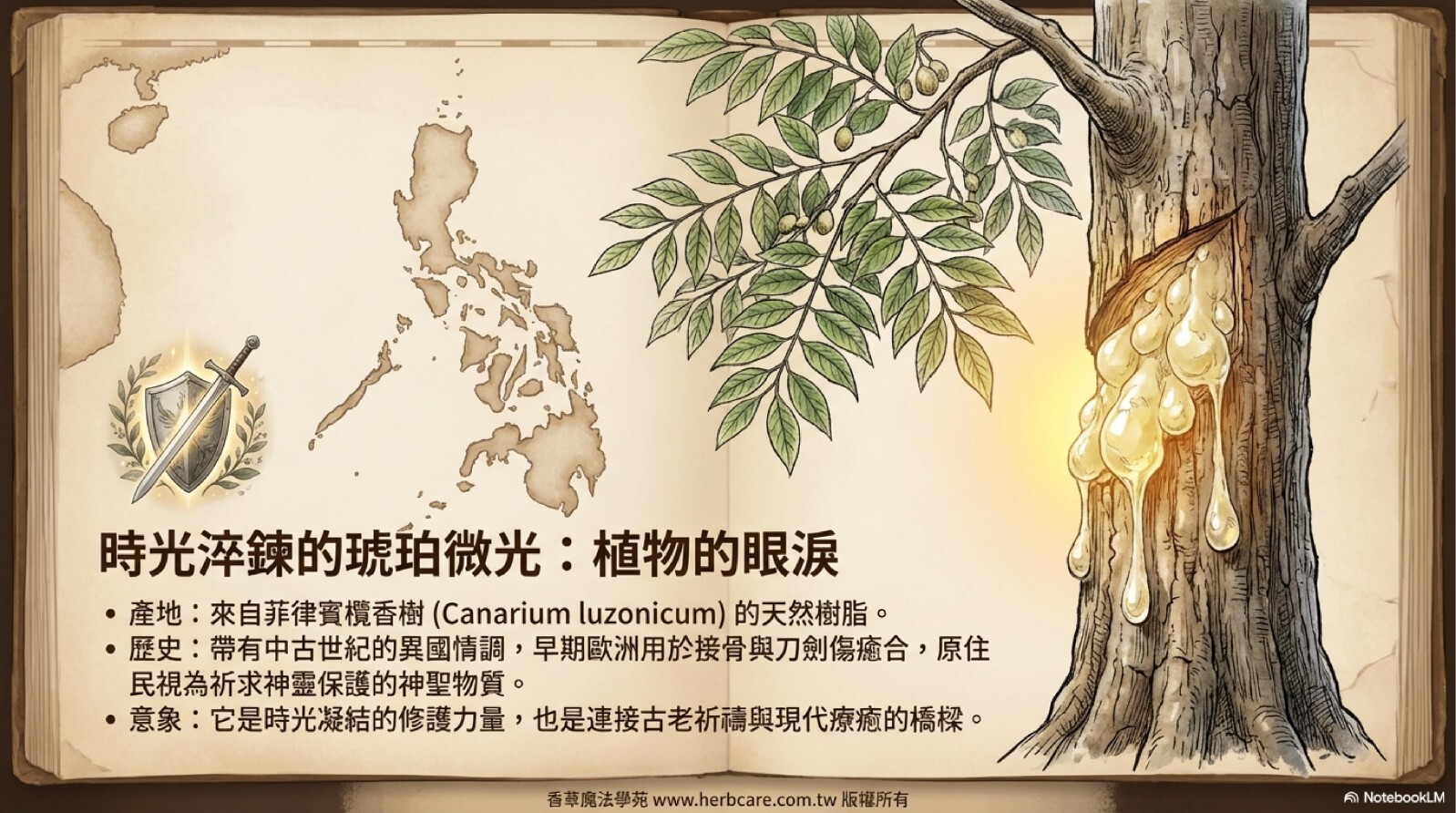 菲律賓欖香脂精油是很特別的樹脂類精油,精油並不特別濃郁,卻有種沈年木質的澀味又帶點梅子的味道,非常具有中古世紀的異國情調。在早期的歐洲主要用來接骨與刀劍傷的癒合,成分主要為水芹烯,與帖酸類醇類,用於防腐及抗氧化。