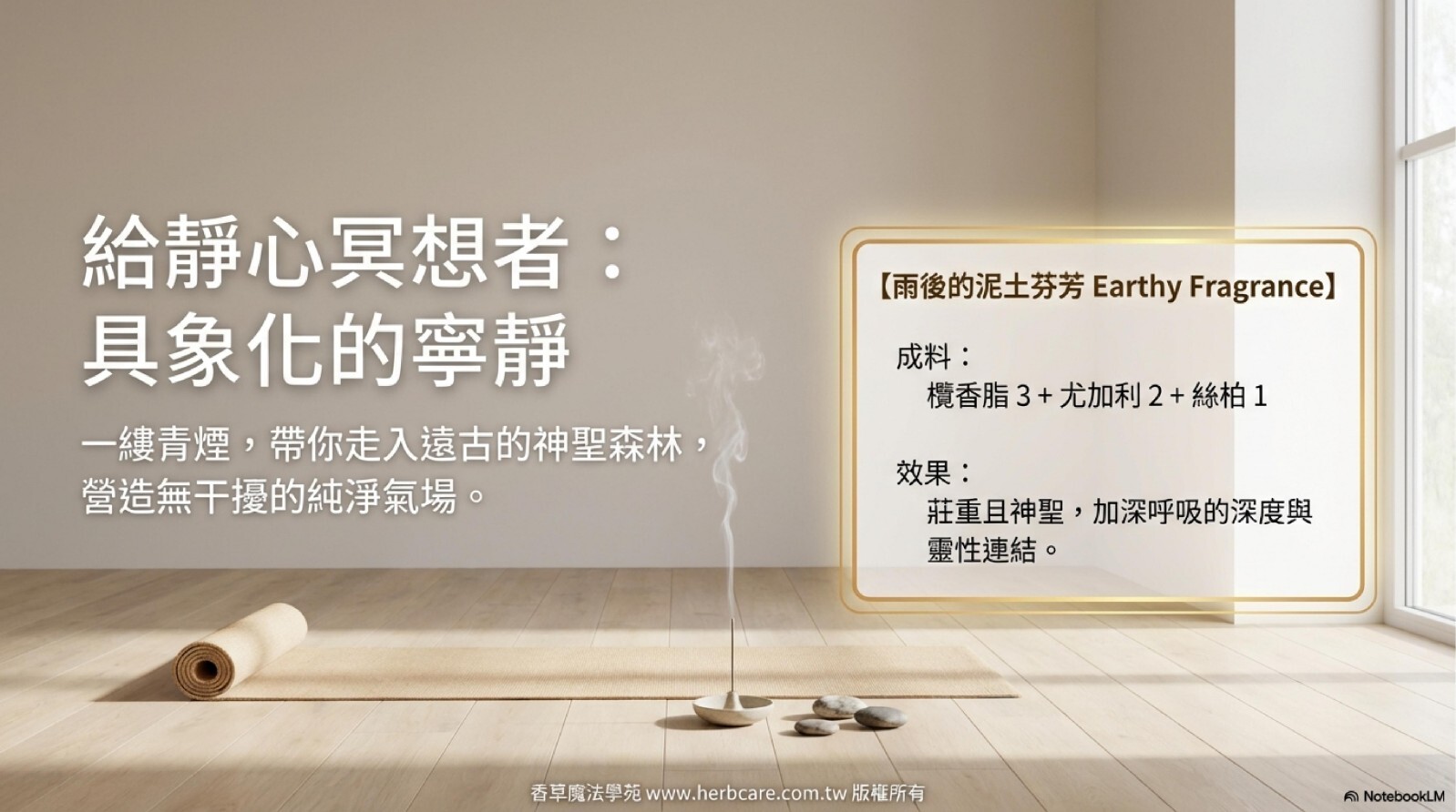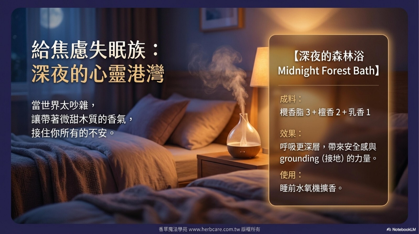 需求/時間點:當你感到焦慮、心神不寧時;或是想在睡前、冥想前,為自己創造一個寧靜的空間。