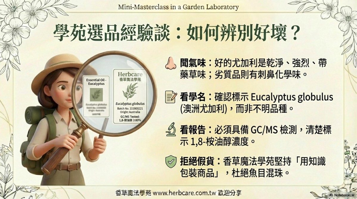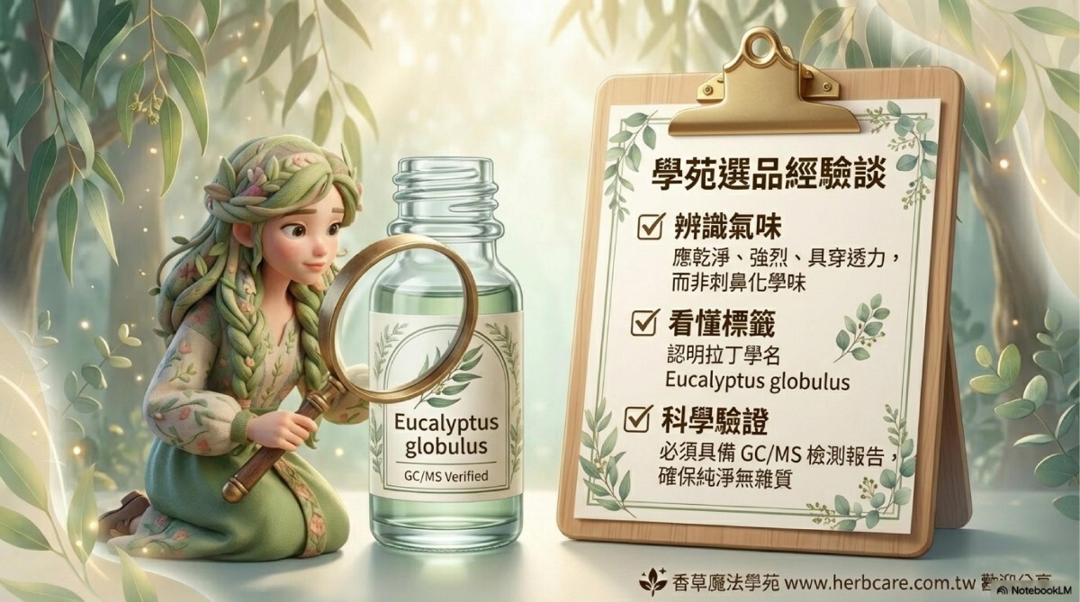 挑選尤加利精油時,最關鍵的是確認其主要化學成分。高品質的尤加利精油應含有高濃度的1,8-桉油醇,這是其淨化與清涼效果的來源。在選購時,可以聞一下香氣,好的尤加利精油應該是乾淨、強烈、帶有穿透力的藥草氣味,而不是刺鼻的化學味。一個負責任的品牌會清楚標示拉丁學名,確保你買到的是澳洲尤加利,而不是其他品種。此外,GC/MS檢測報告是判斷精油主成分與品質的重要依據,它能讓你清楚了解精油的成分比例,確保其純淨無雜質。記住,選對精油,就像為你的身心找到一位信賴的夥伴,讓你安心享受植物帶來的能量。